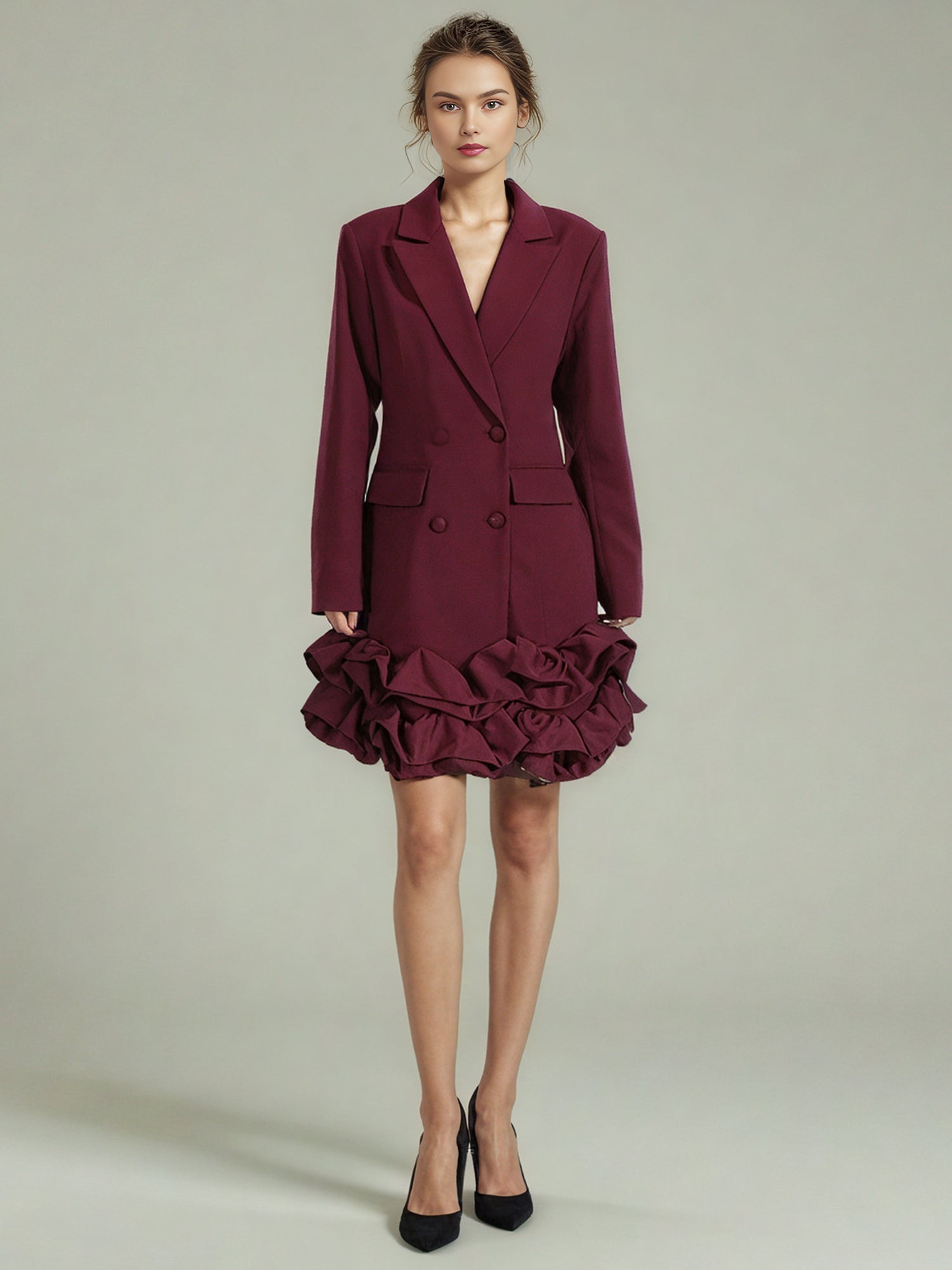 - Double-breasted cut, ruffle hem, creating a unique silhouette.