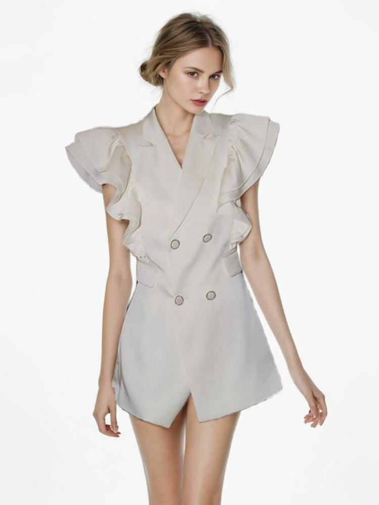 Indulge in the sophistication of our Causal Vintage Solid Dresses. With its milk white blazer-style design, figure-flattering cinched waist, and delicate ruffled short sleeves, this dress exudes a timeless charm. Perfect for any occasion, it's a must-have for any tasteful wardrobe.