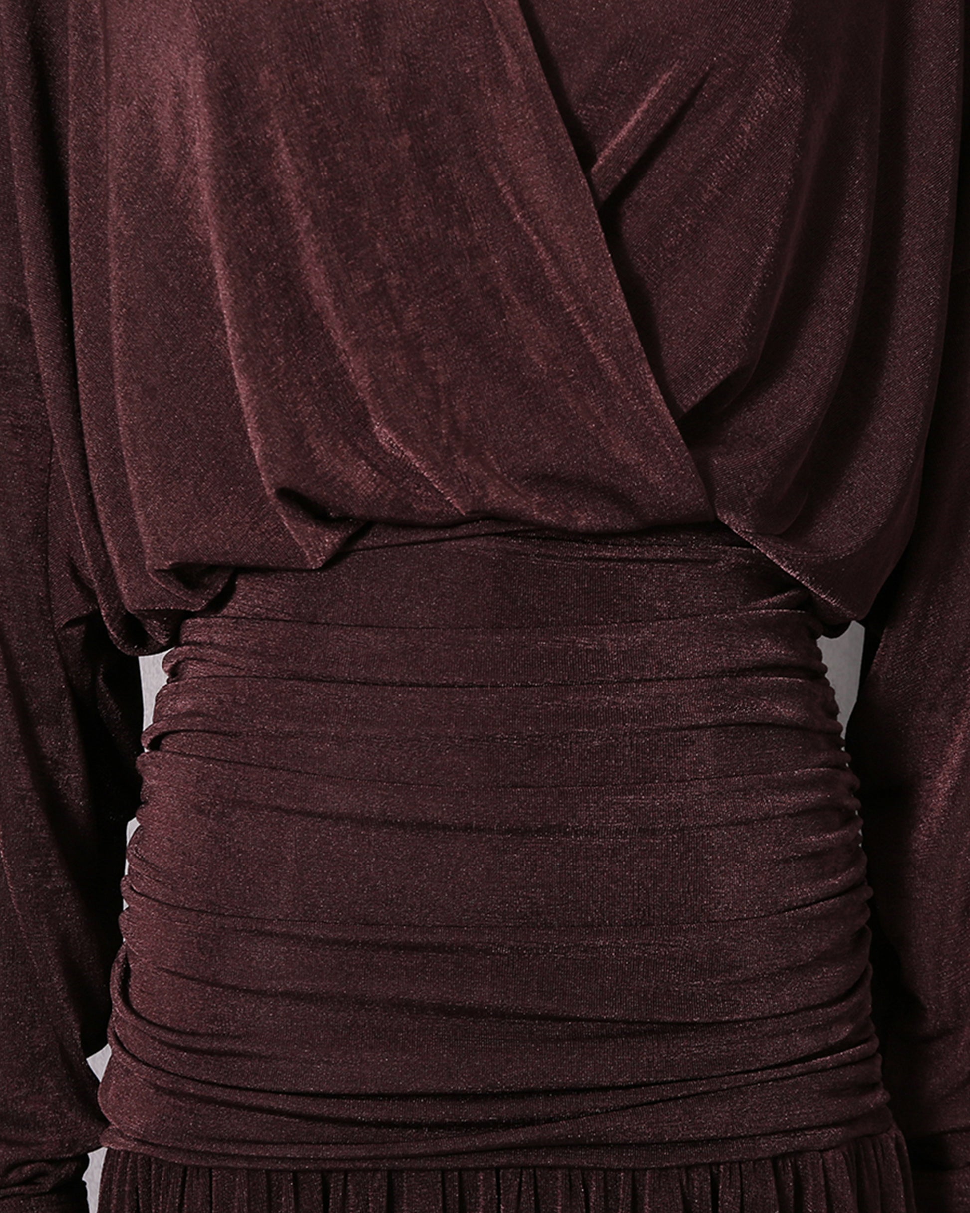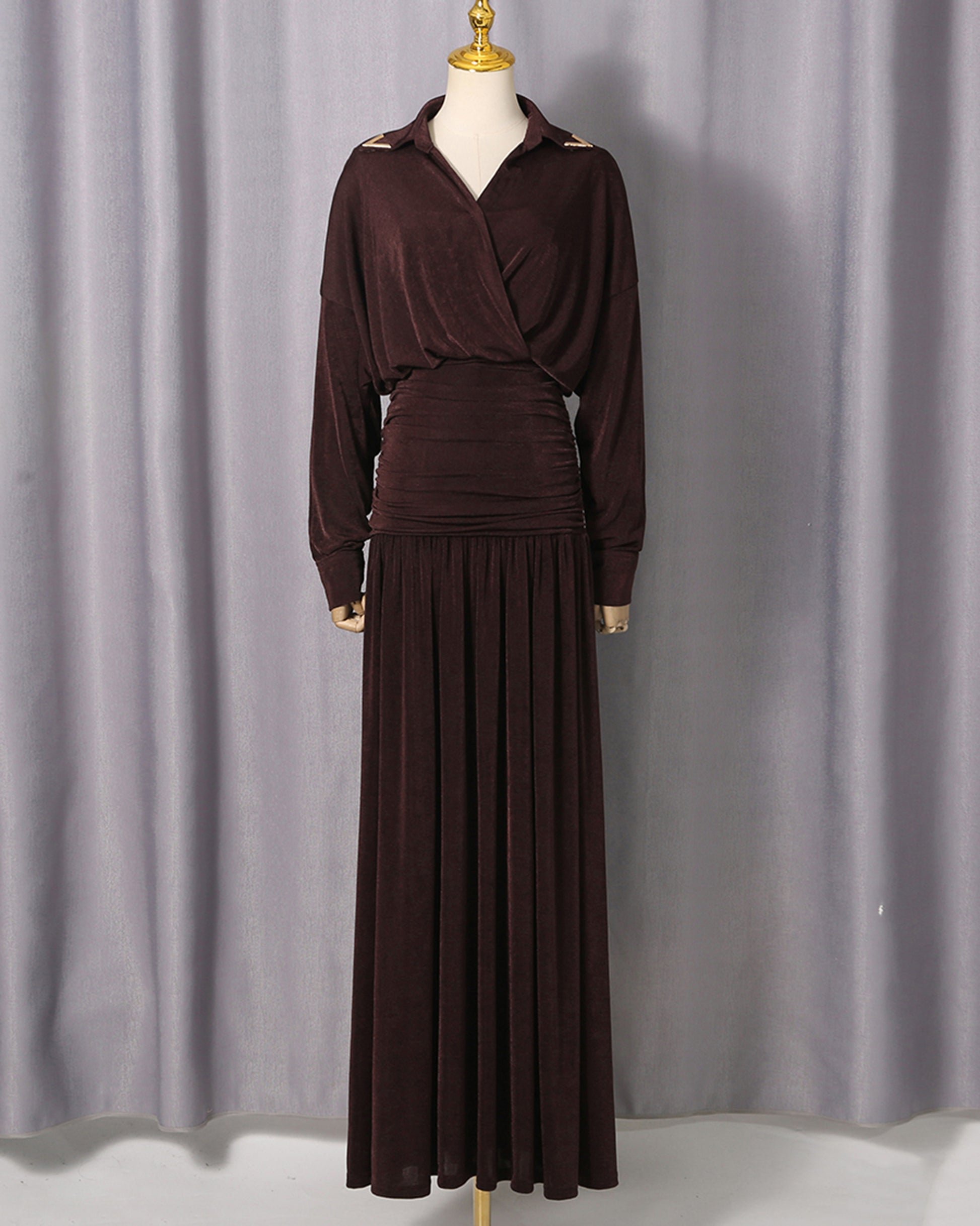 A sophisticated maxi dress: collared neckline with shoulder epaulettes + wrap-front bodice + long sleeves + ruched waist detail + flowing pleated skirt + soft stretchy fabric.