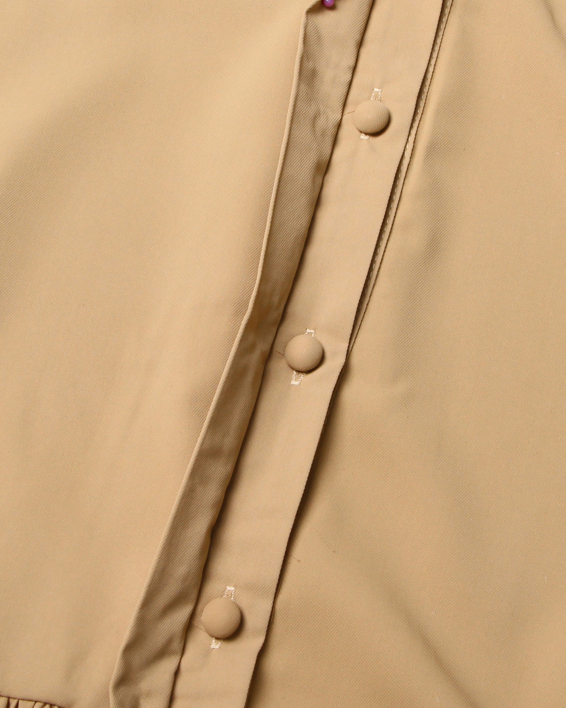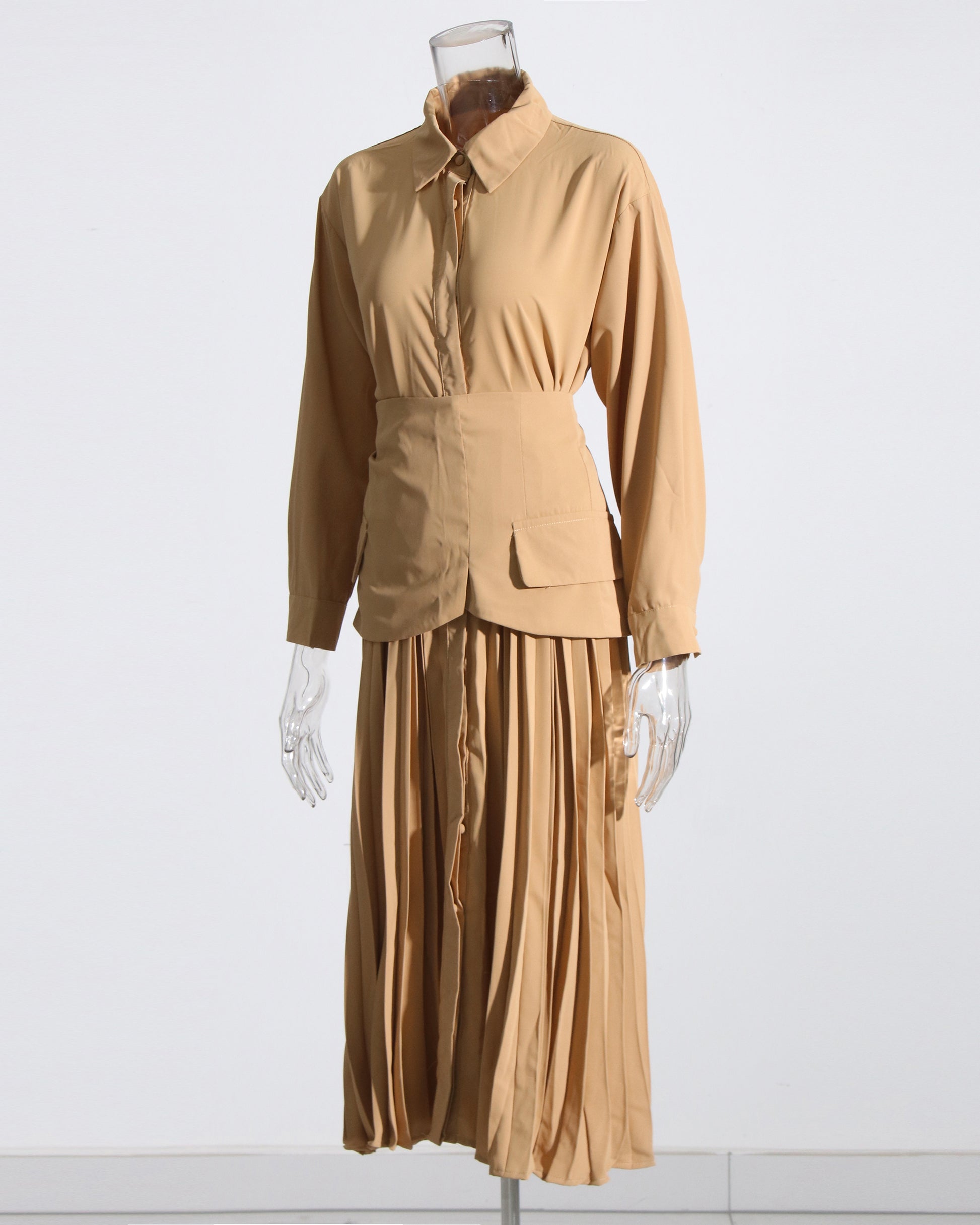 Coffee Pleated Midi Shirt Dress with Built-In Waist