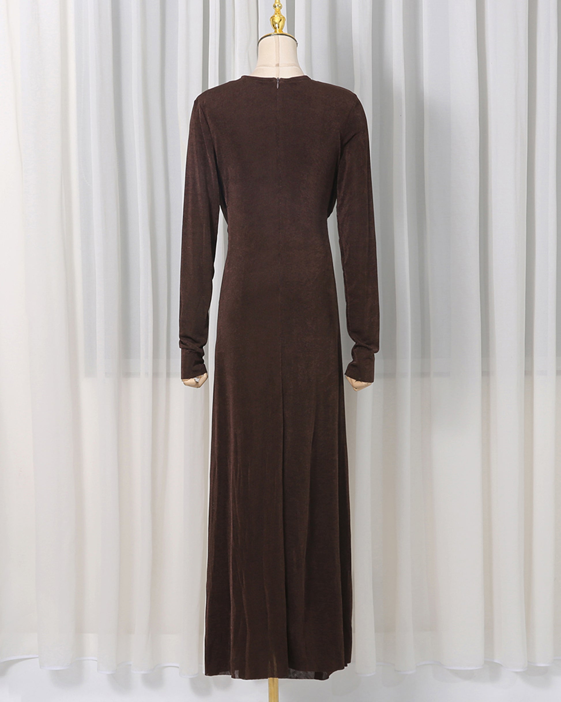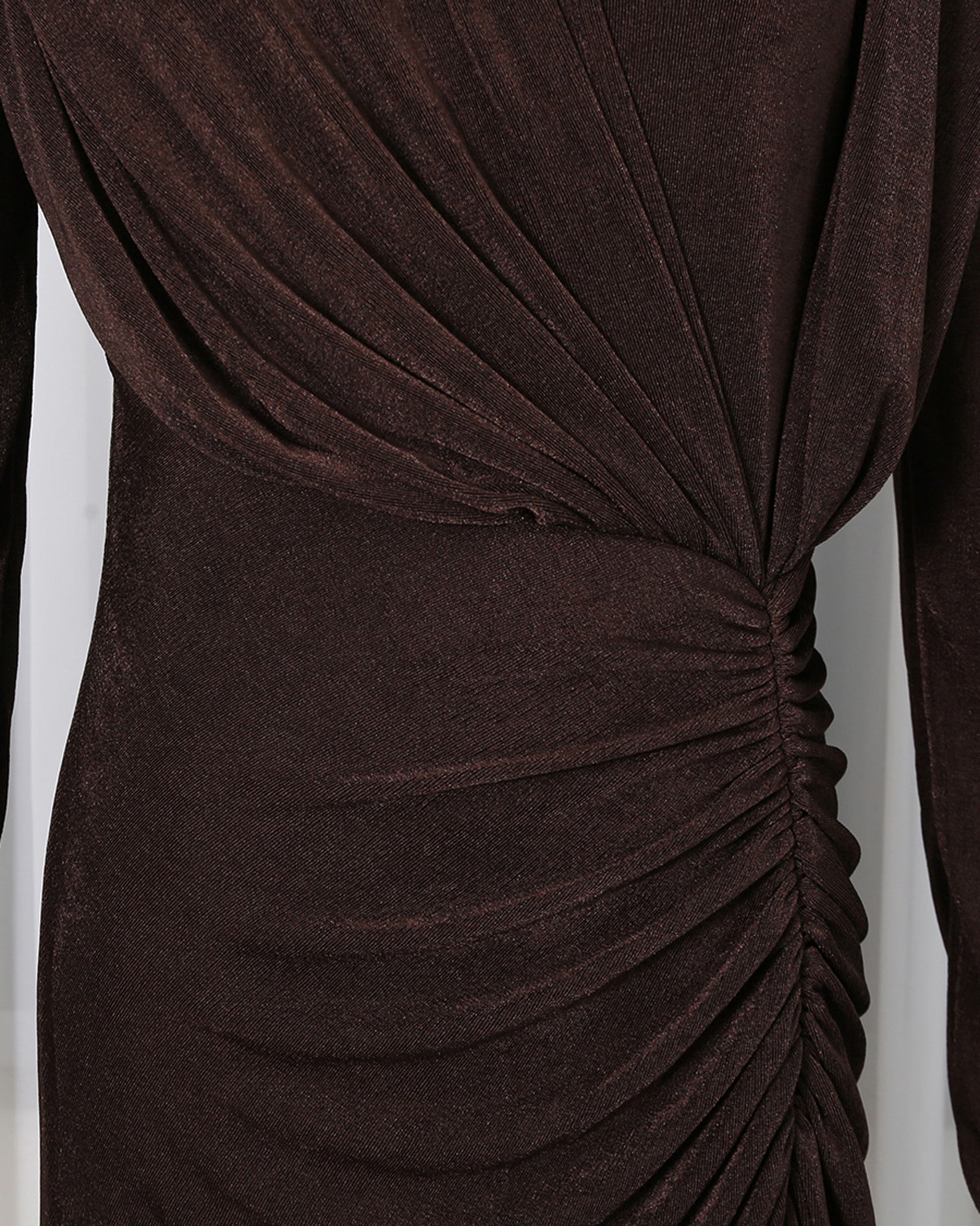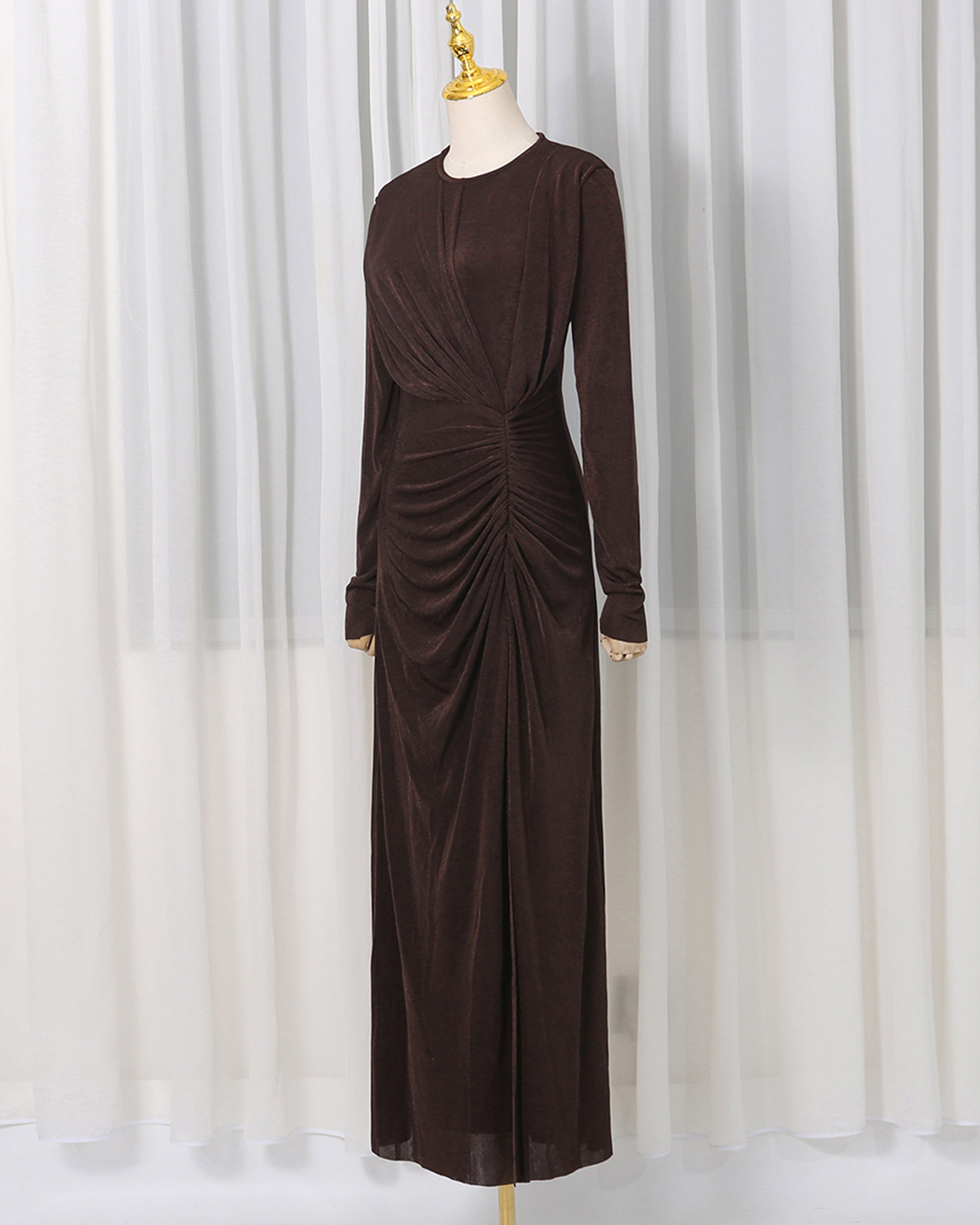 A sophisticated maxi dress: crew neck + long sleeves + asymmetric ruched detailing + slim-fit silhouette.