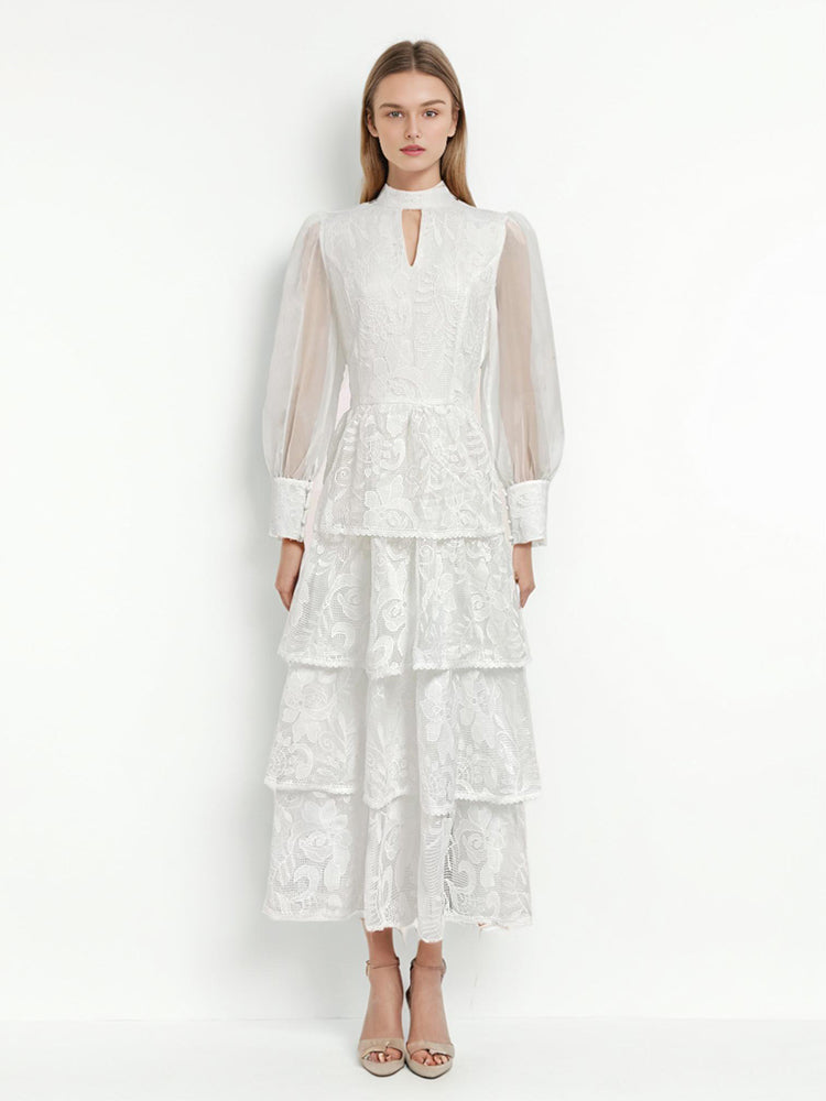Indulge in luxury with our Elegant Hollow Out Embroidery Long Dress. This exquisite garment features intricate cutout details and delicate embroidery, creating a see-through effect that is both alluring and sophisticated. With lantern sleeves and a ruffled hem, this dress exudes elegance and style. Elevate your wardrobe with this statement piece.
