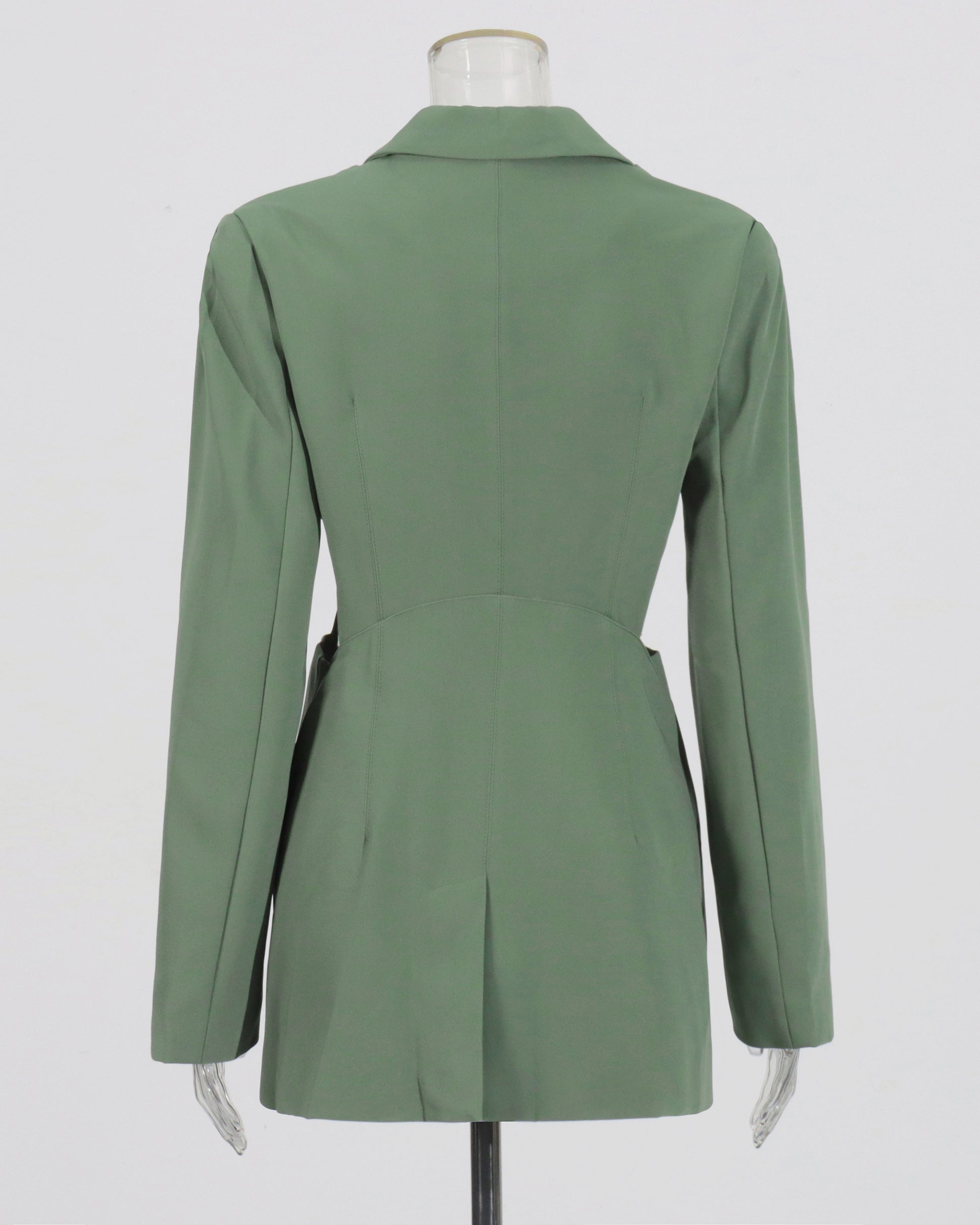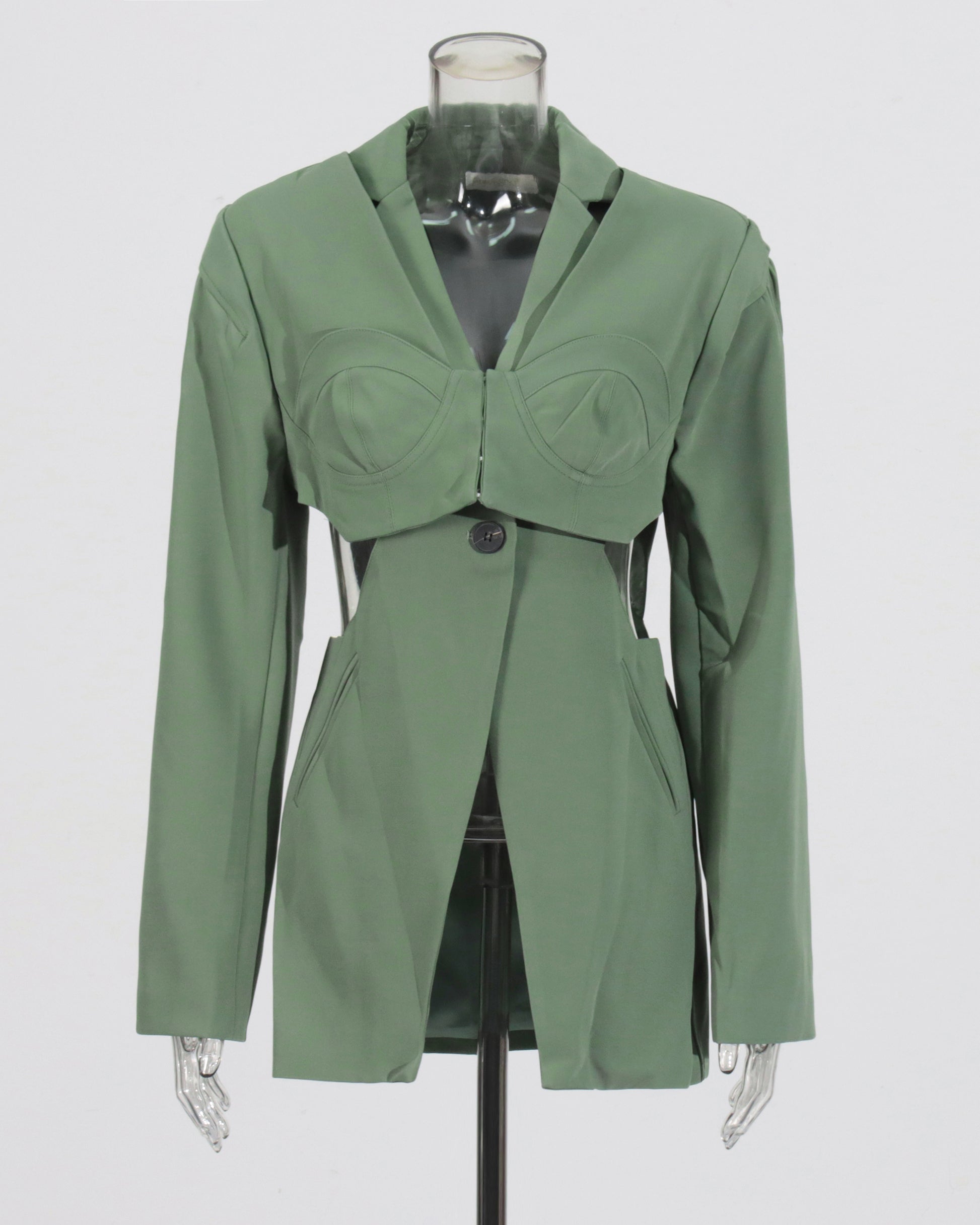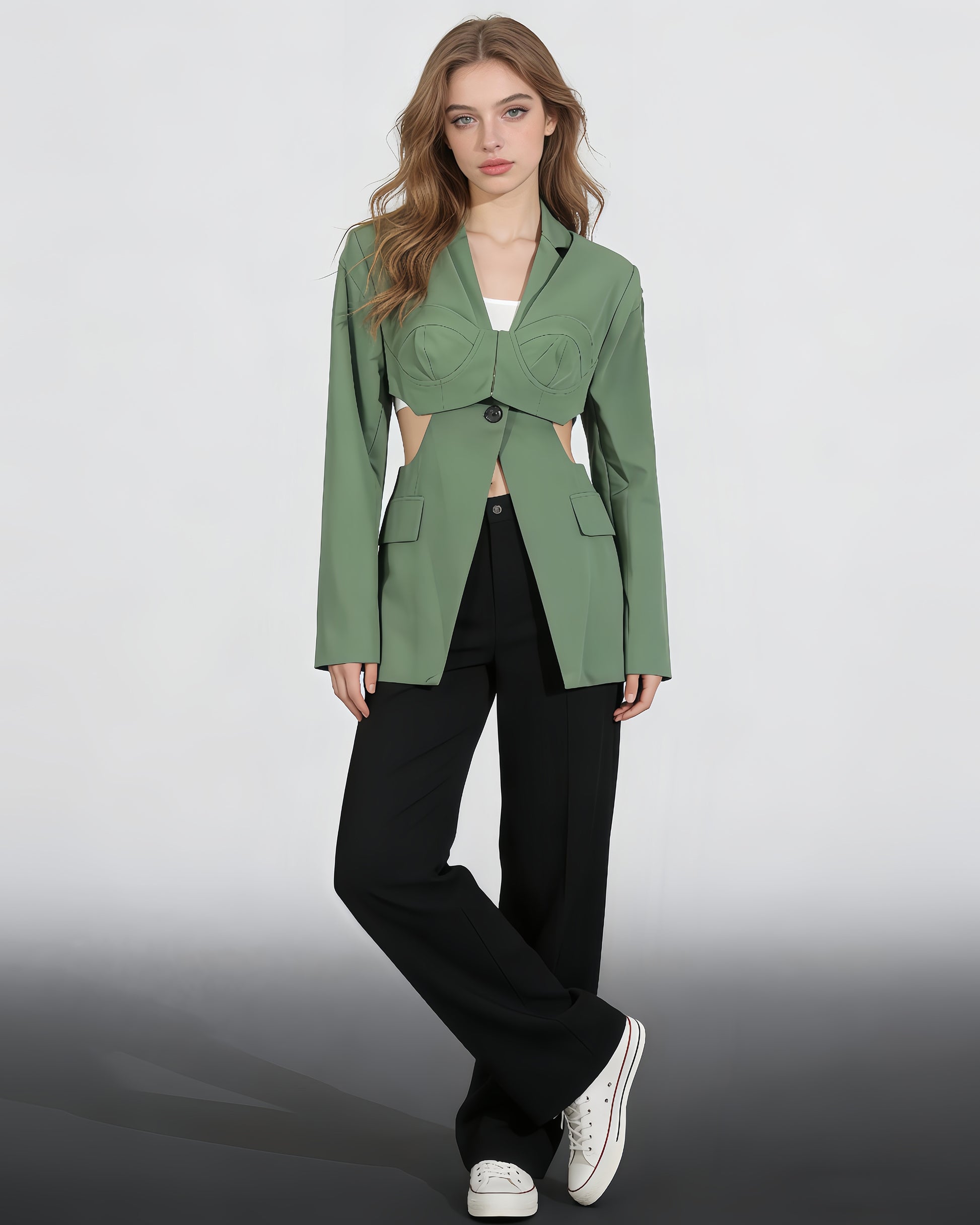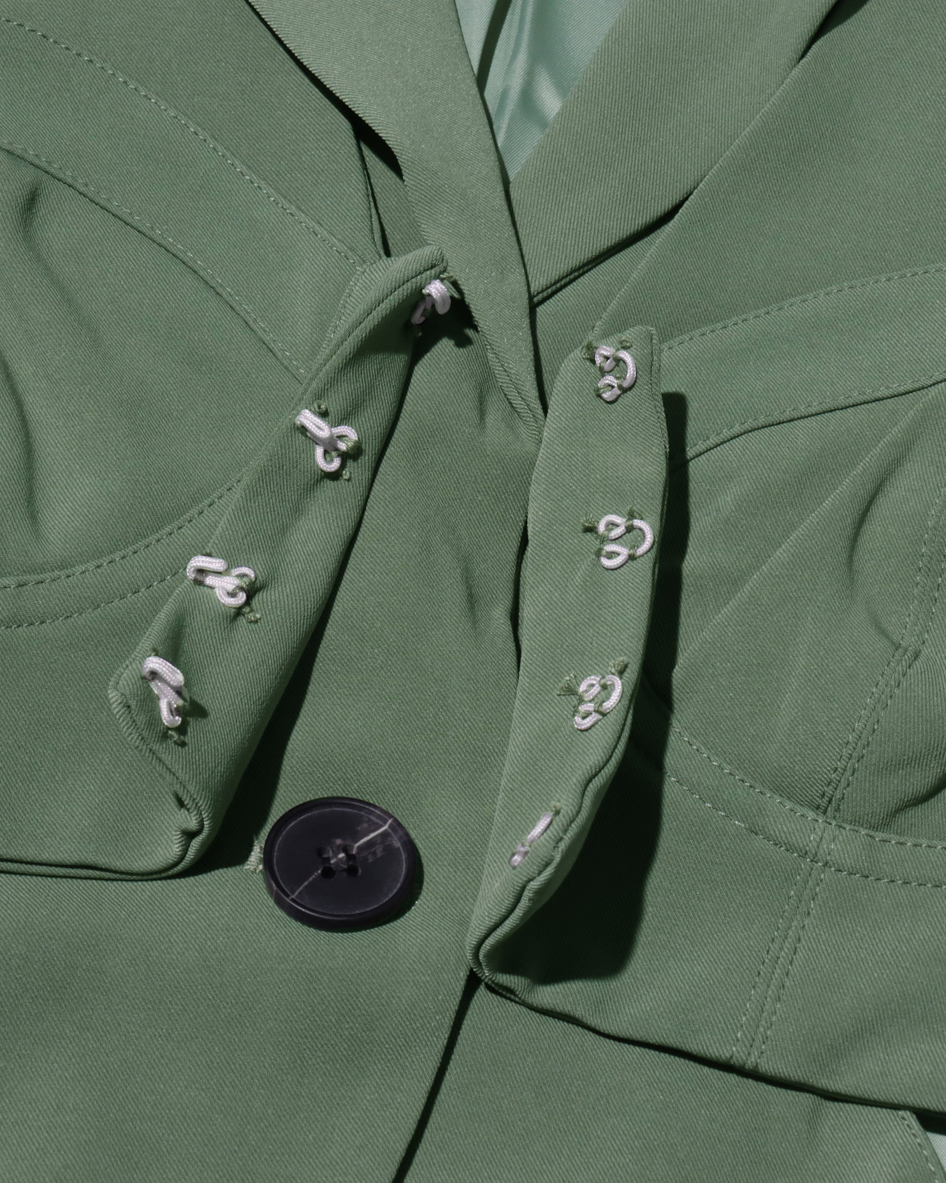 - Edgy, tailored silhouette, blending structured style and playful flair.
