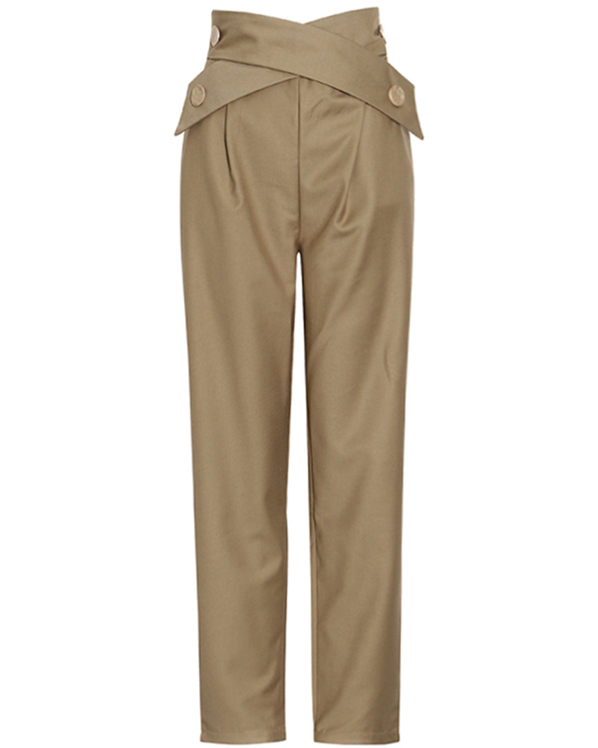Khaki Cross-Waist Button-Accent Tapered Pants