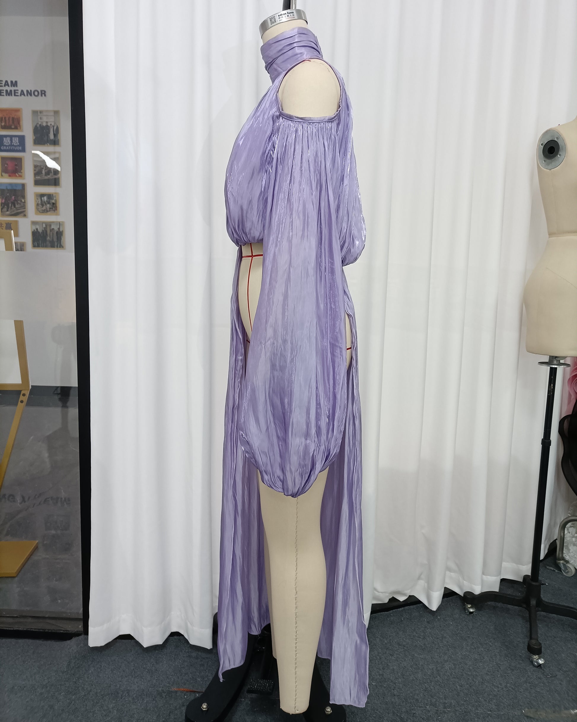 Purple Halter Cold-Shoulder Draped Cropped Top