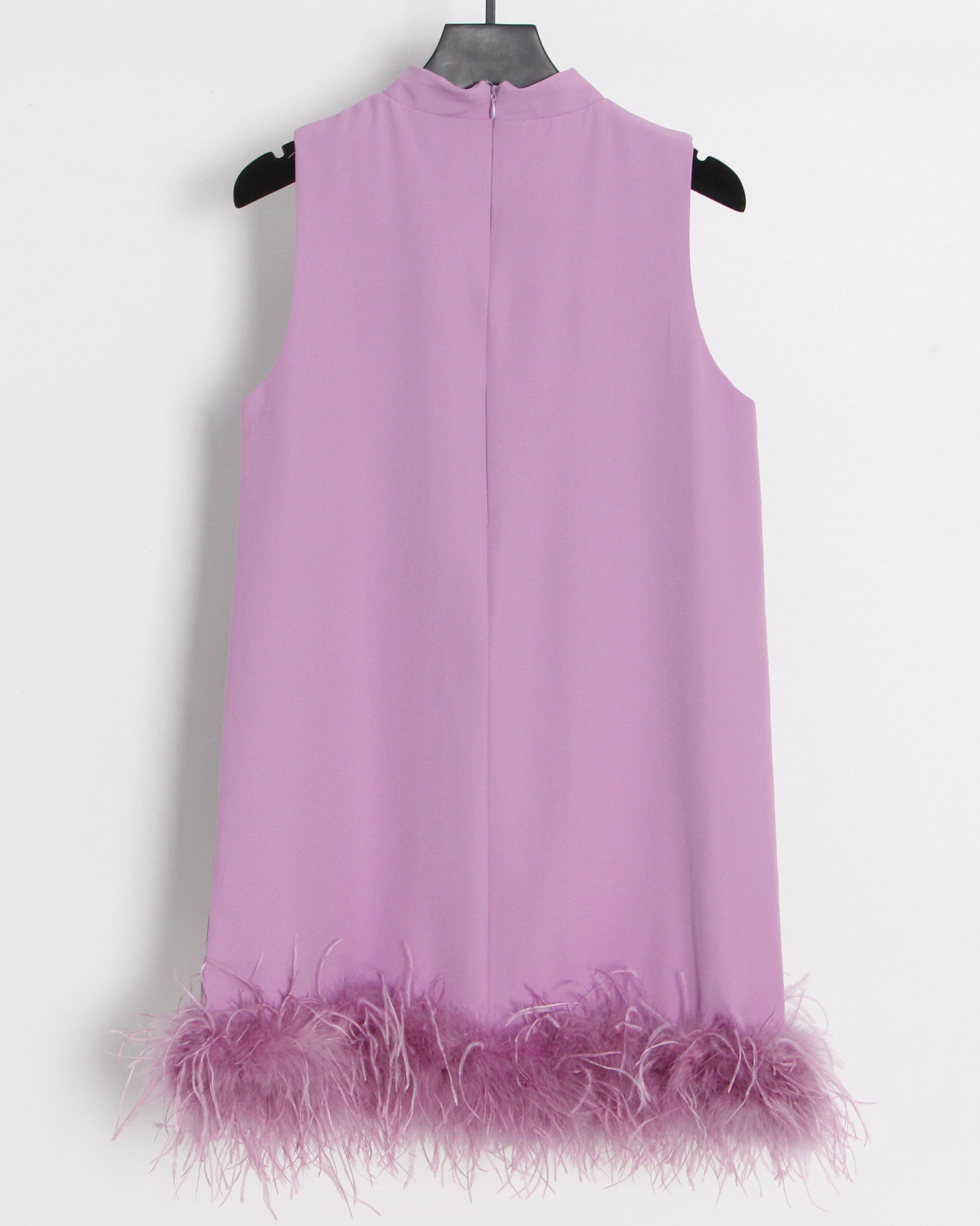 Purple Sleeveless Turtleneck Dress with Feather Hem