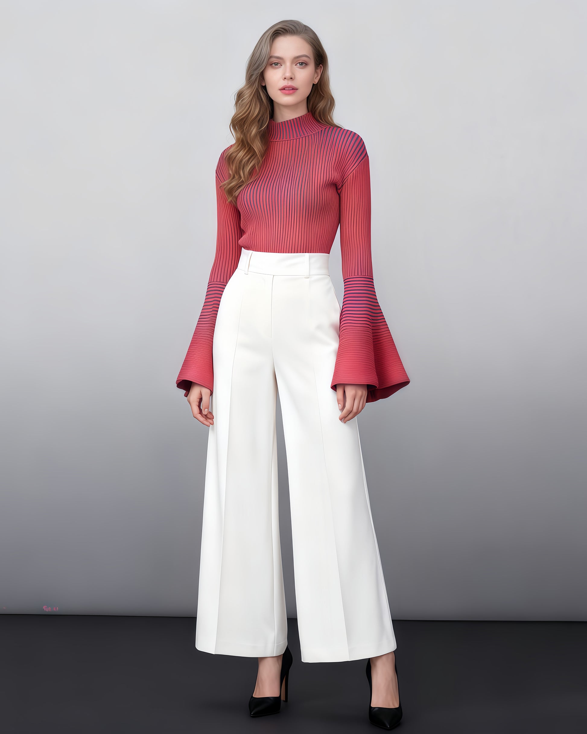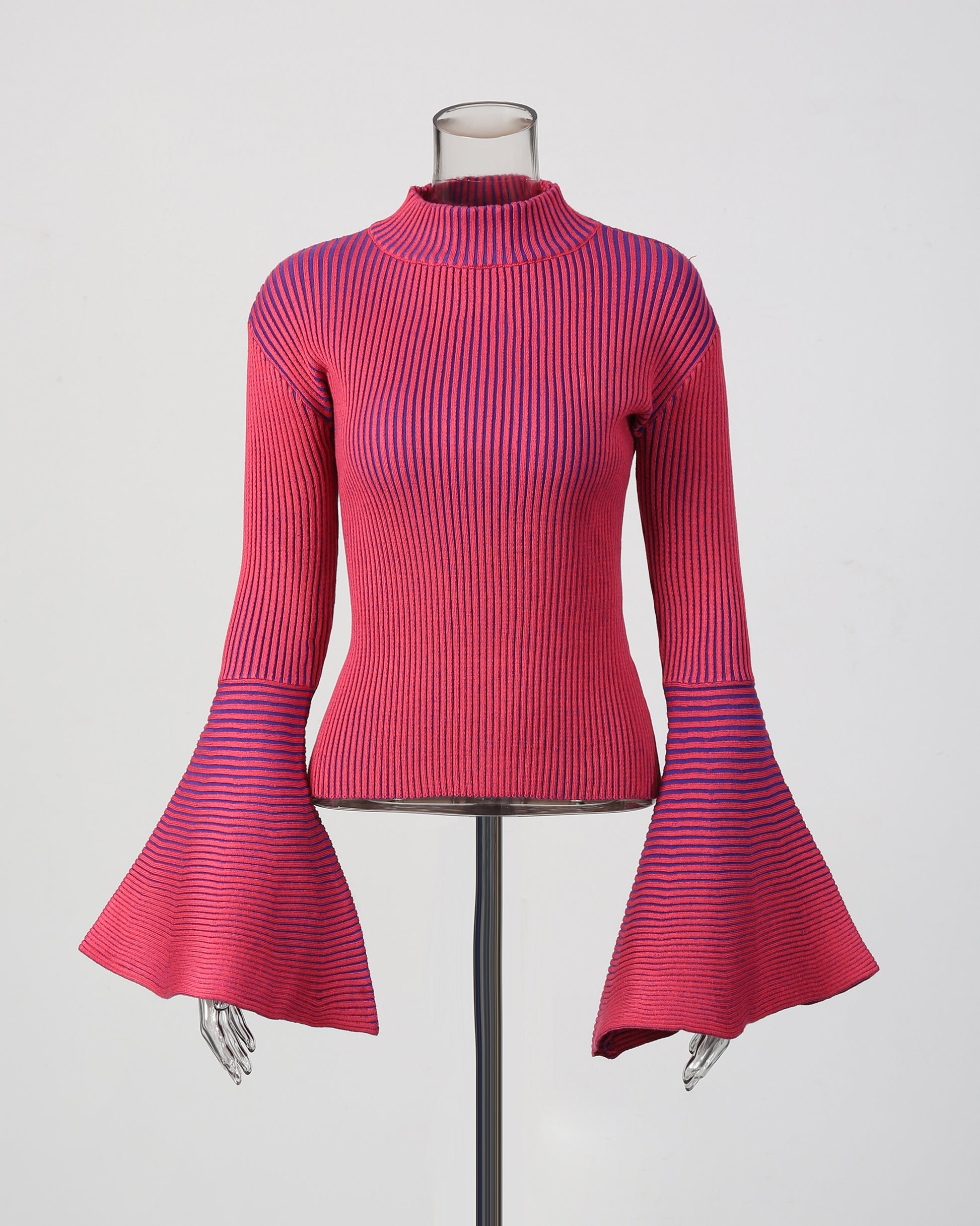- Striped pattern, bell sleeves, high neck, creating a stylish silhouette.