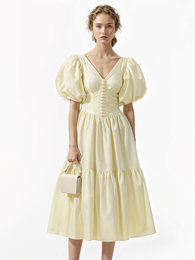 Indulge in the luxury of our Solid Patchwork Button Sweet Style Dresses. Featuring a creamy yellow color, flattering V-neckline with delicate tie straps, and charming puff sleeves. The waist is cinched to enhance your curves, and the exquisite floral patterns add a touch of elegance. Elevate your style with this beautiful dress.