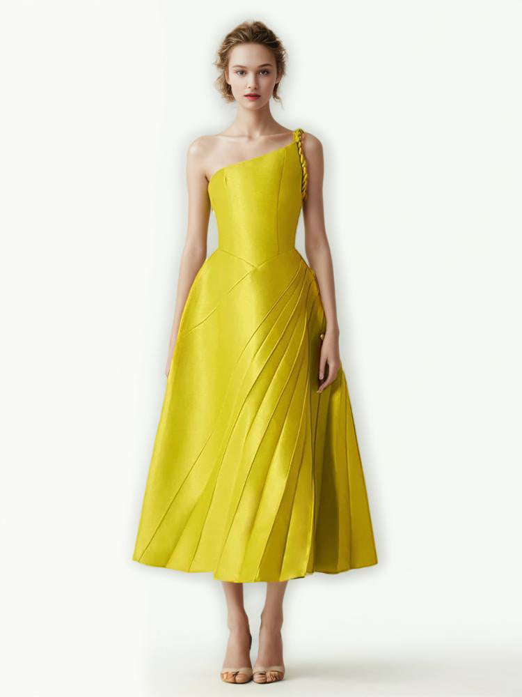 Experience the elegance and grace of our Solid Spliced Folds Fashion Dress. This stunning dress features a single shoulder and delicate pleats, exuding sophistication and luxury. Perfect for any special occasion, this dress is a must-have for those who appreciate timeless style and artful design.