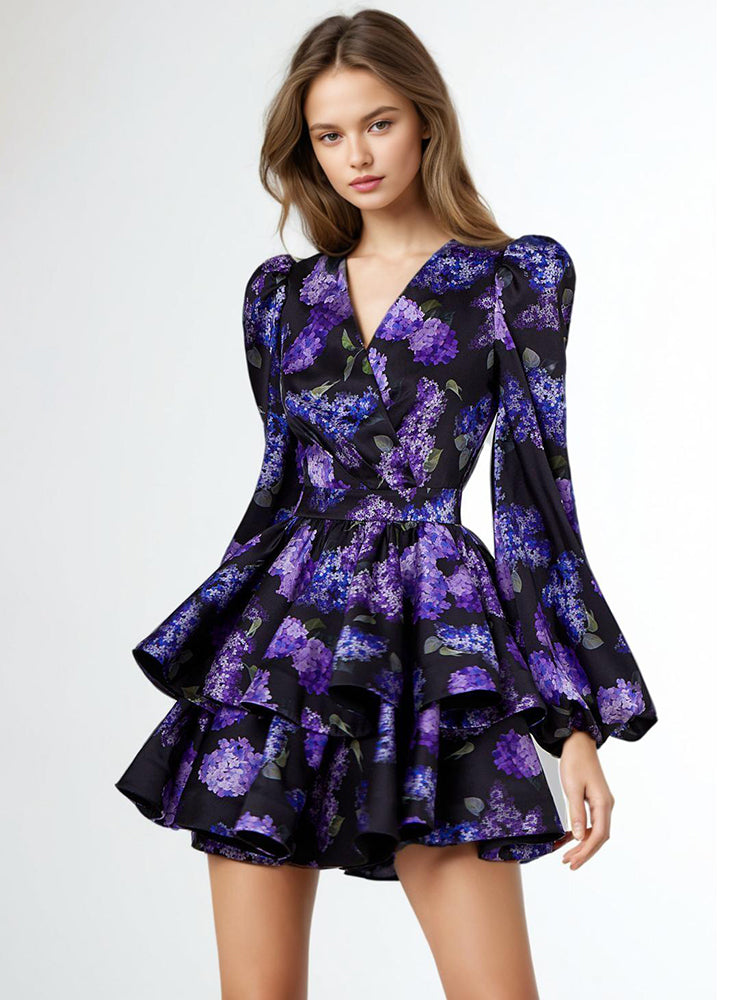 Indulge in the elegance of our Vintage Printing Mini Dresses. Featuring a V-neck, lantern sleeves, and a cinched waist, this dress is both stylish and flattering. The delicate floral print and ruffled hem add a touch of sophistication to this short-sleeved masterpiece. Perfect for any occasion.