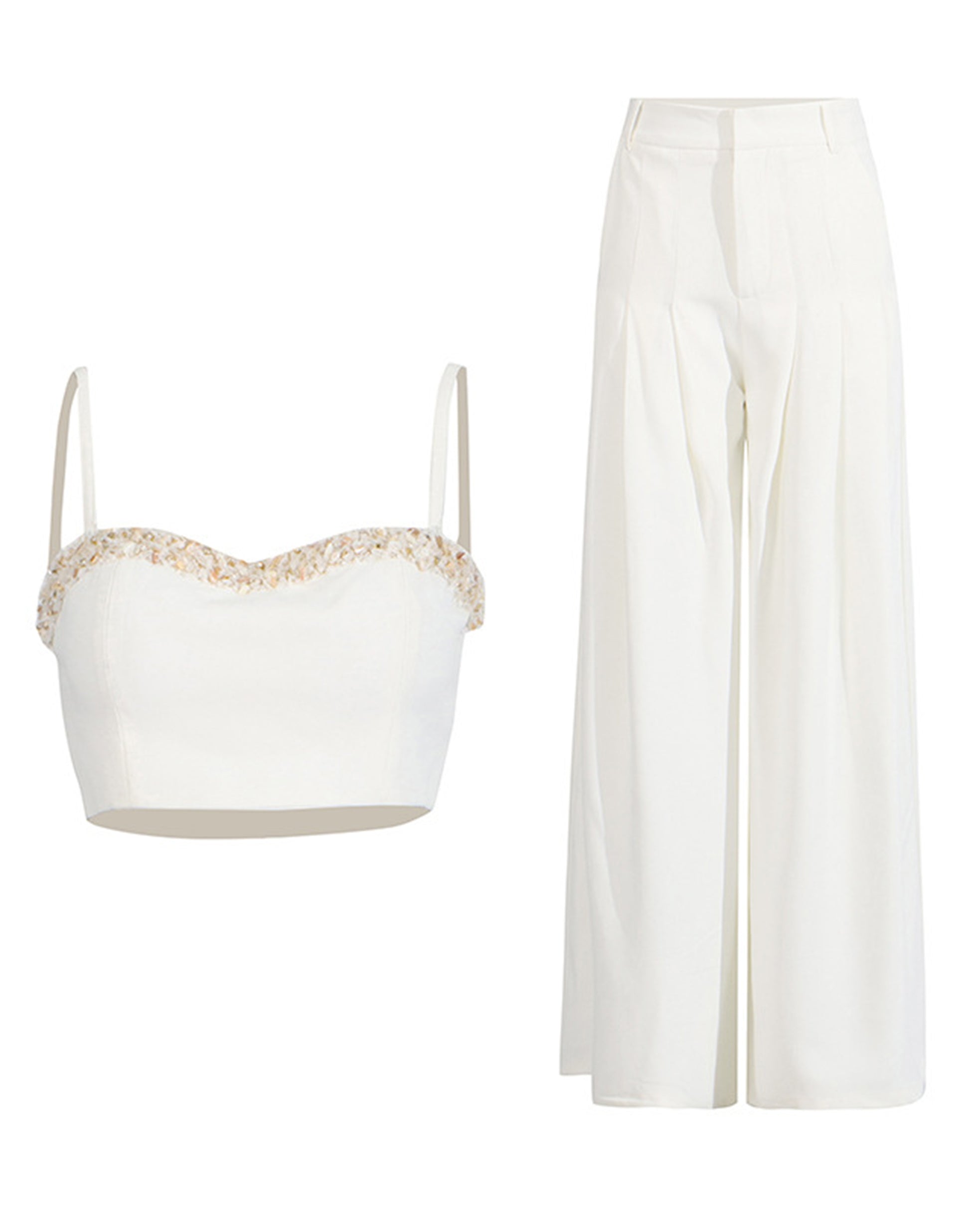 White Beaded Top & Wide-Leg Pants Set