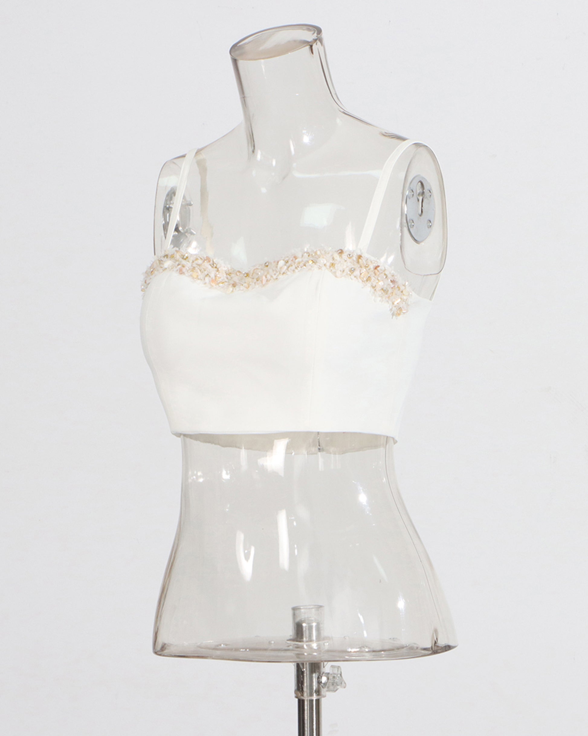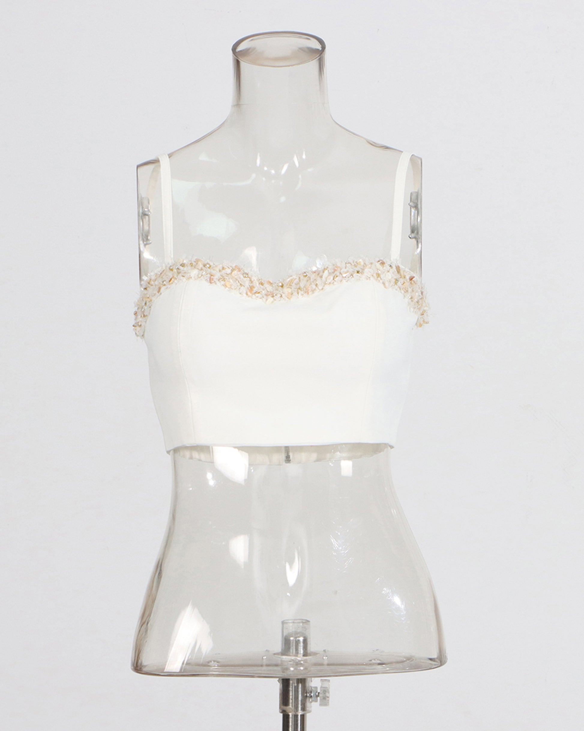 - Feminine, elegant silhouette, blending smooth fabric with delicate beaded accents.