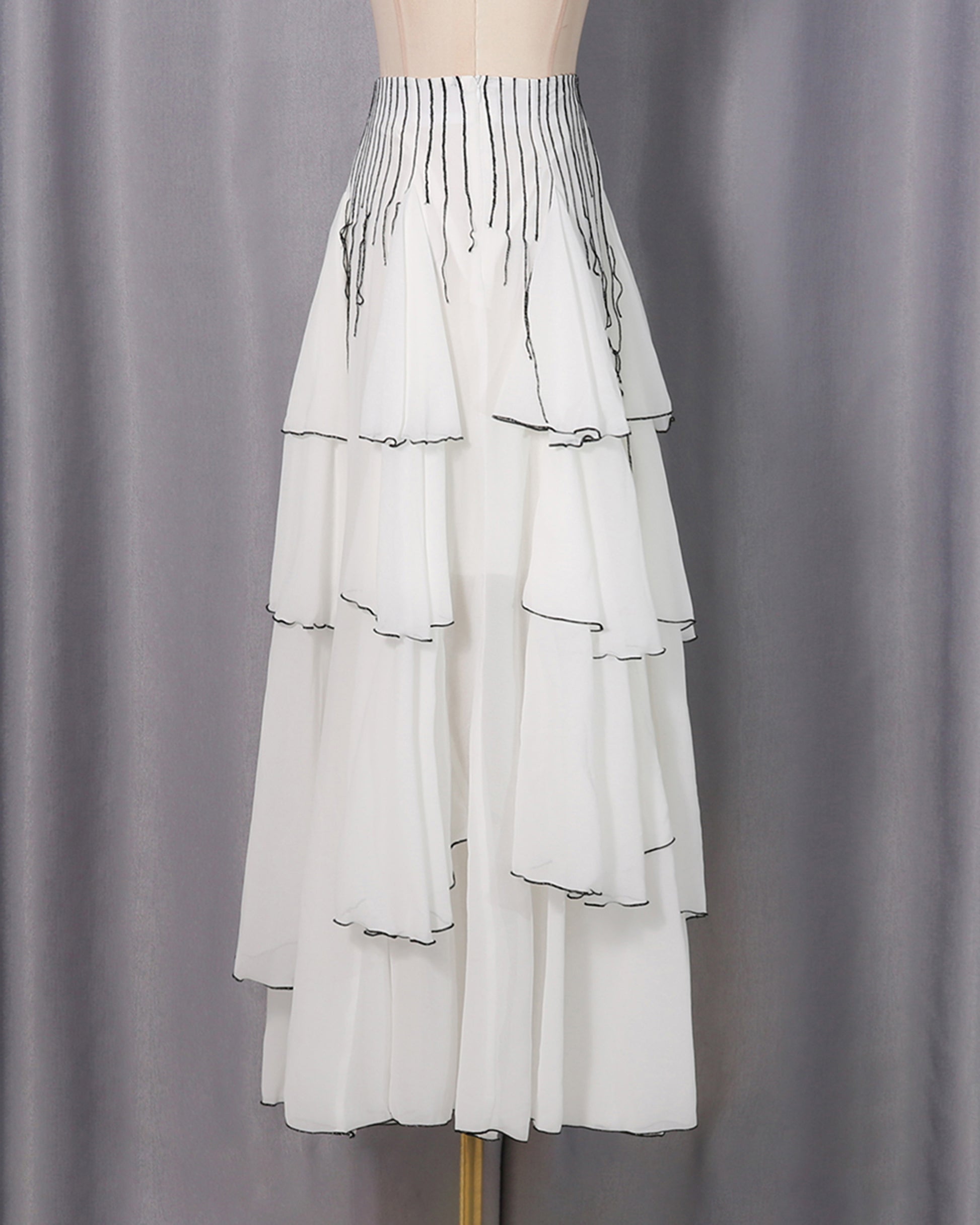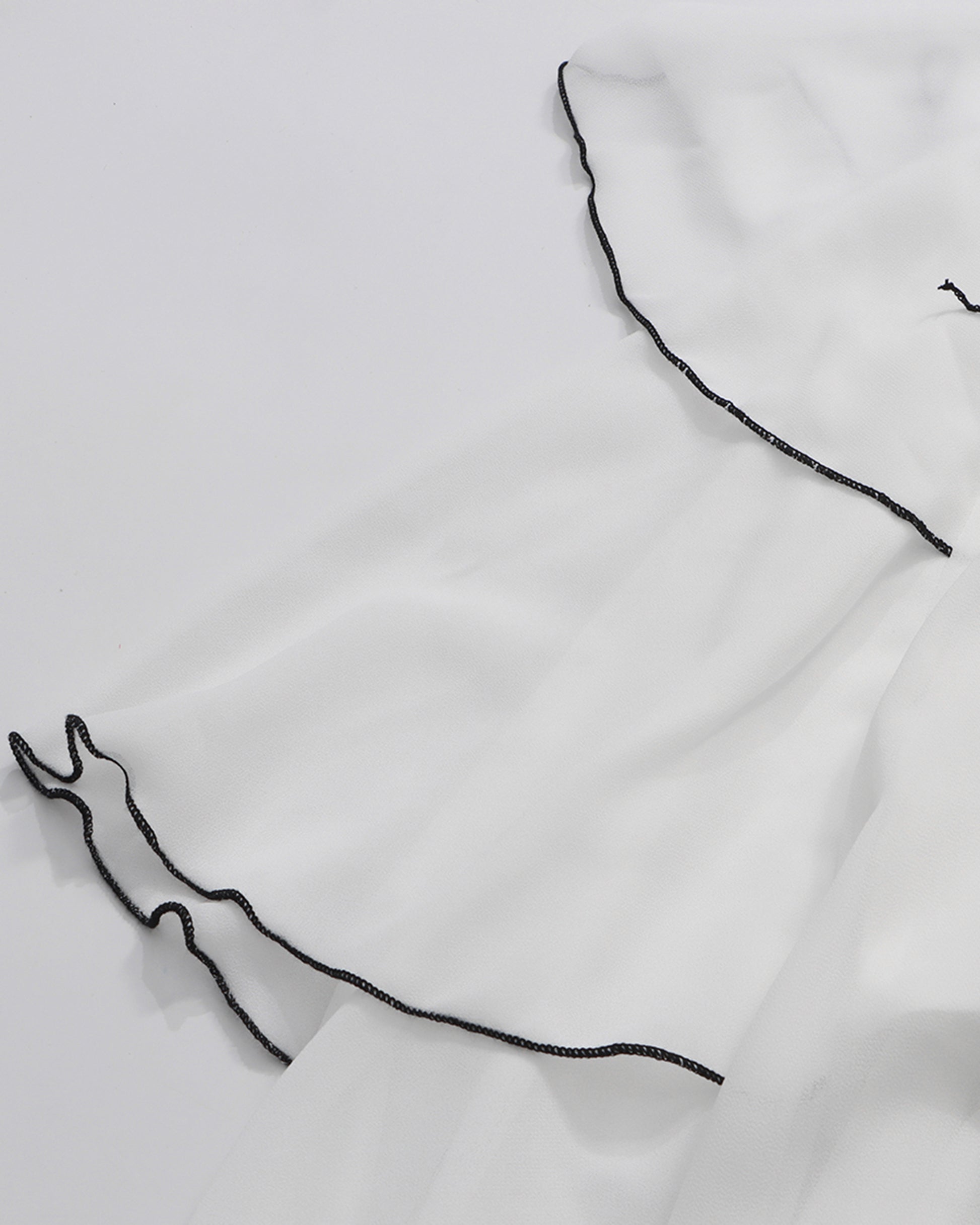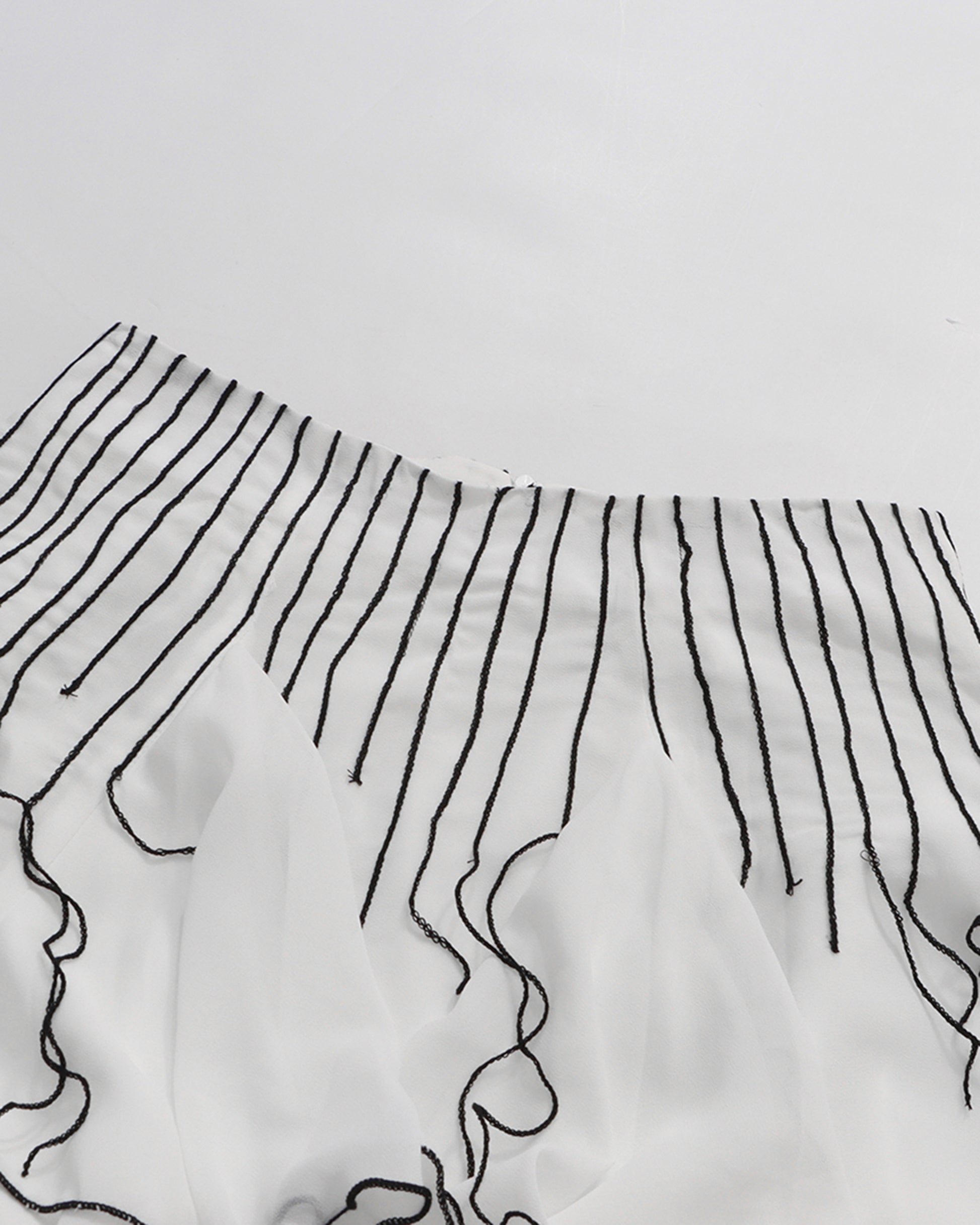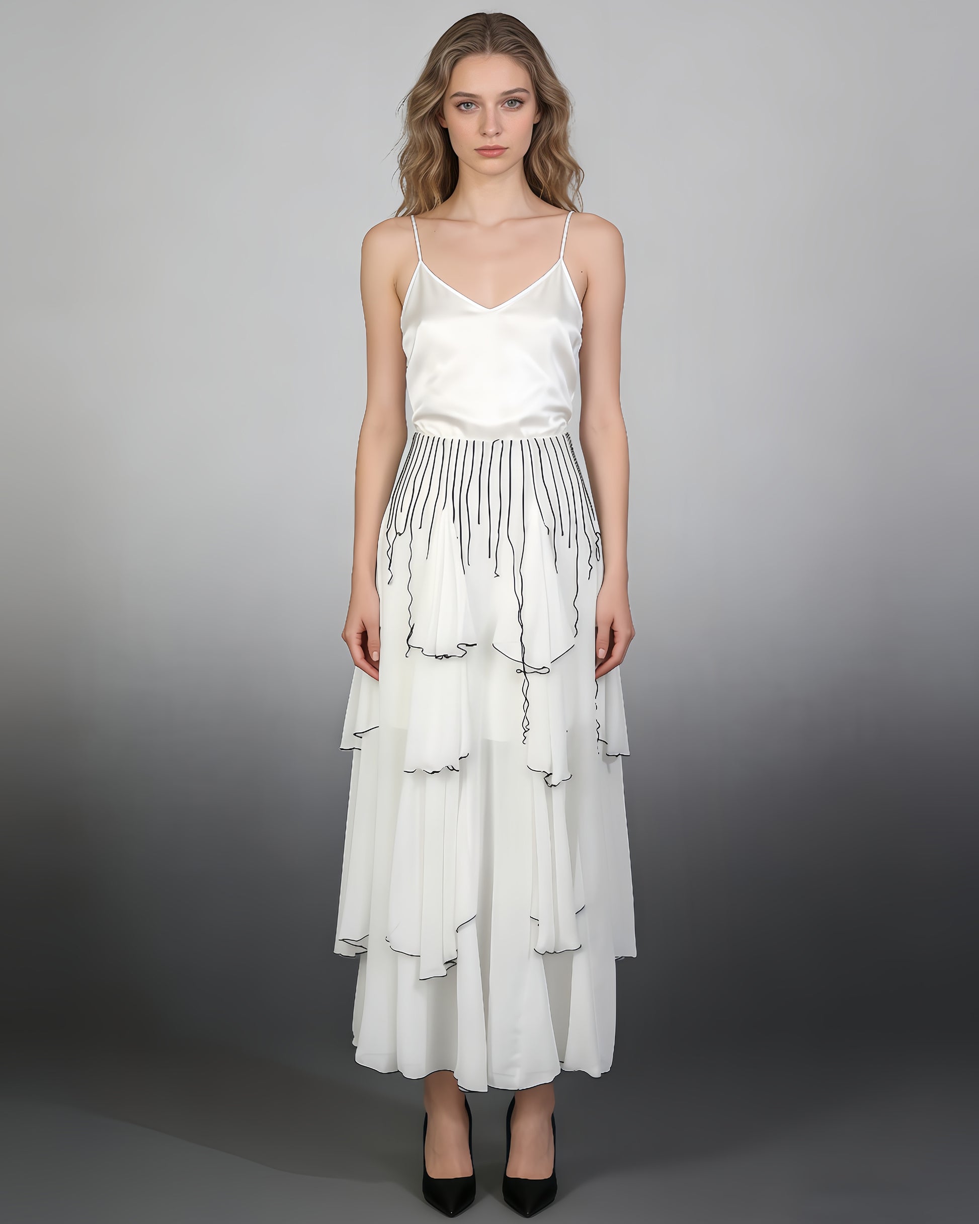 - Artistic, romantic silhouette with dramatic ruffle details and an asymmetric fit.