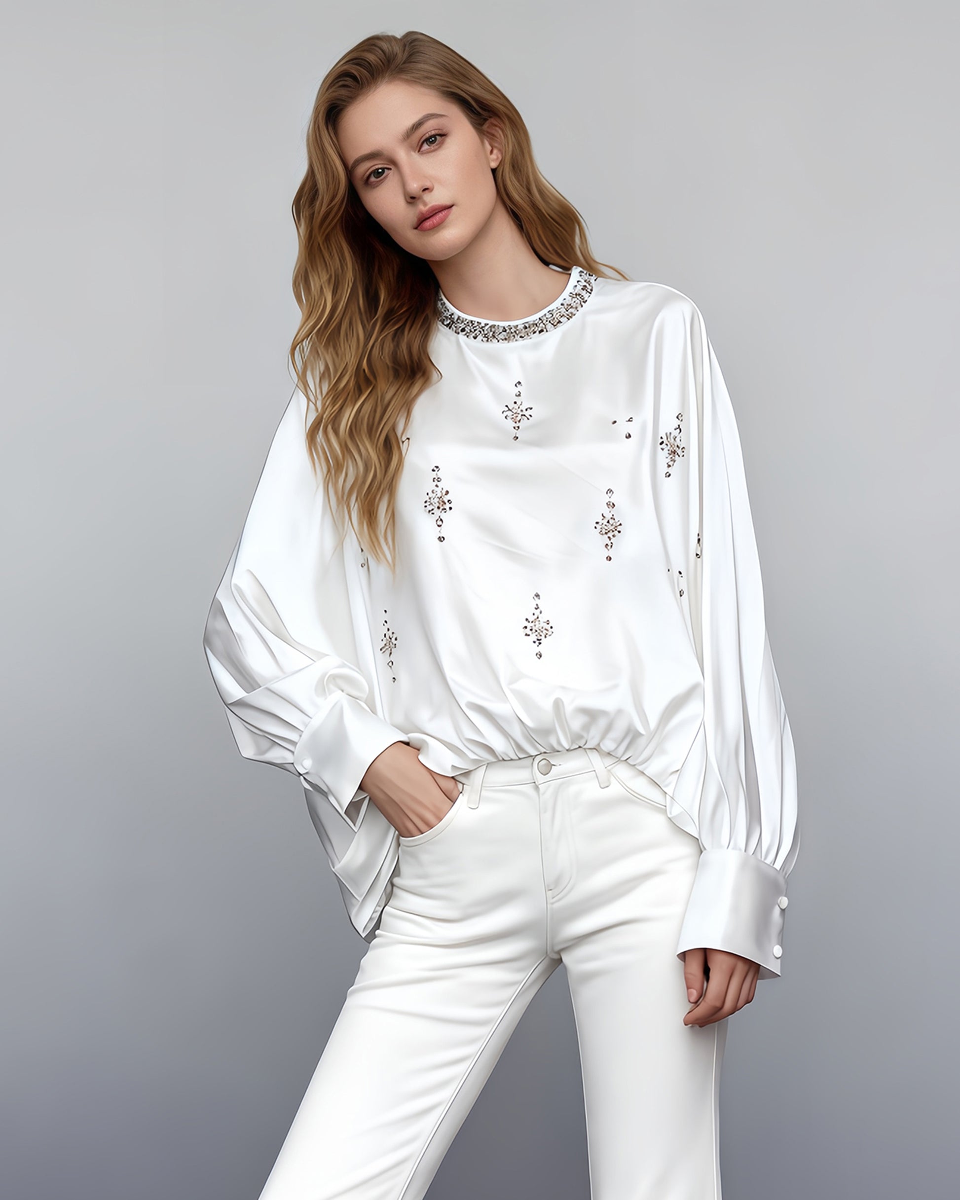 White Blouse with Rhinestone Floral & Batwing Sleeve