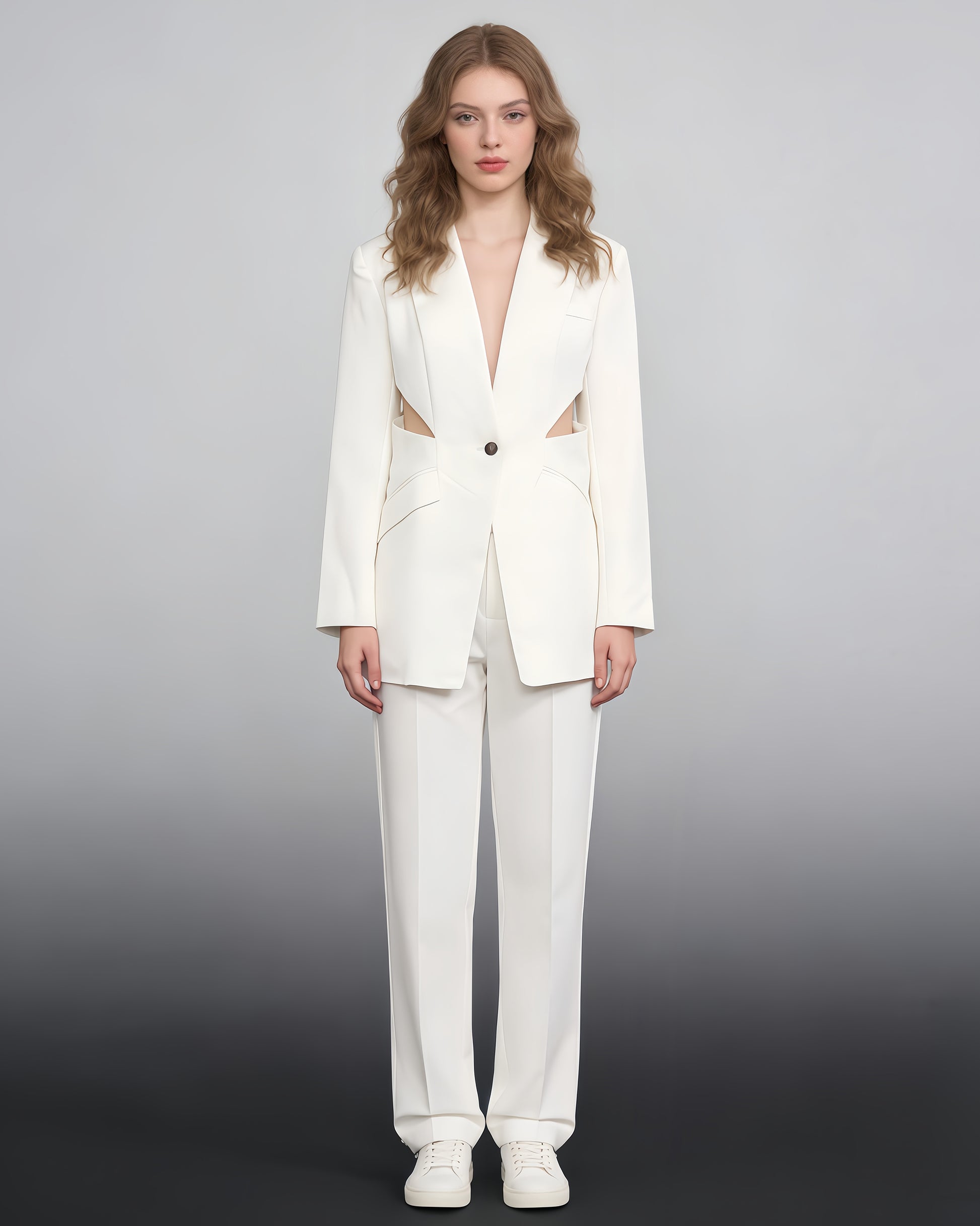 White Cutout Blazer & Wide-Leg Pants Set