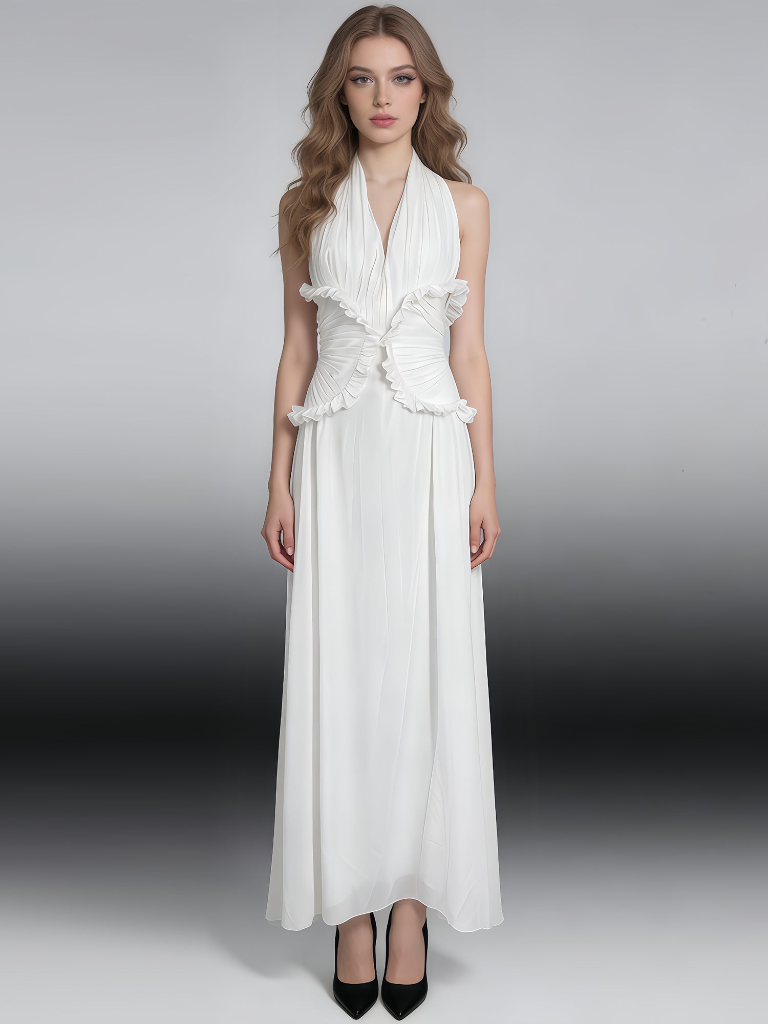 White Halter Gown with Ruffle Accents & Ruched Waist