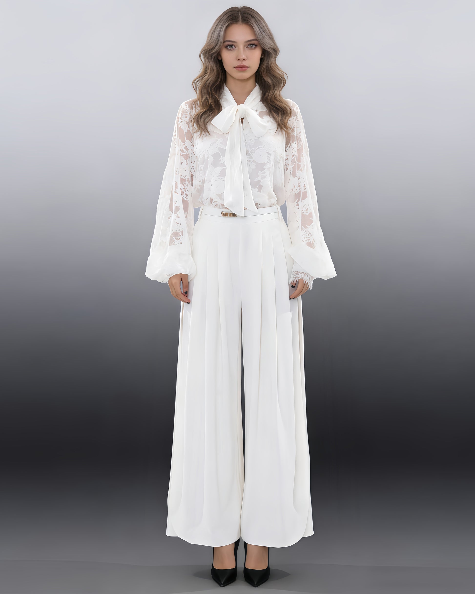 White Lace Bow Blouse & Wide-Leg Pants Two-Piece Set