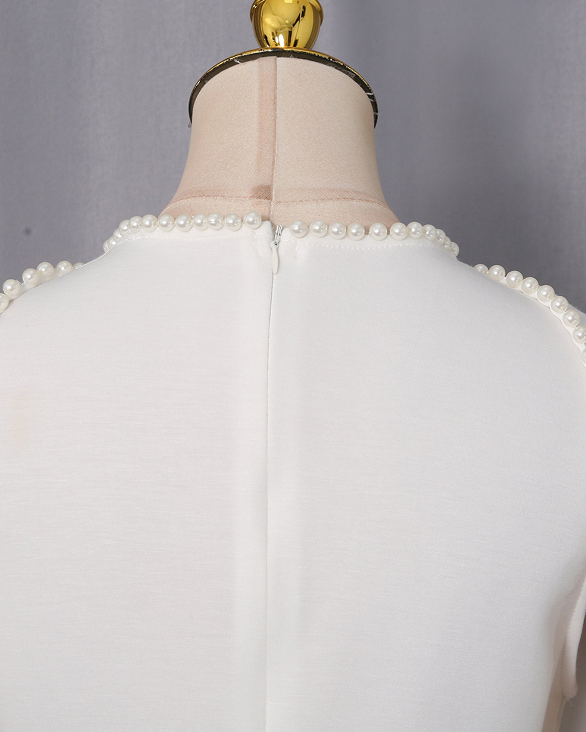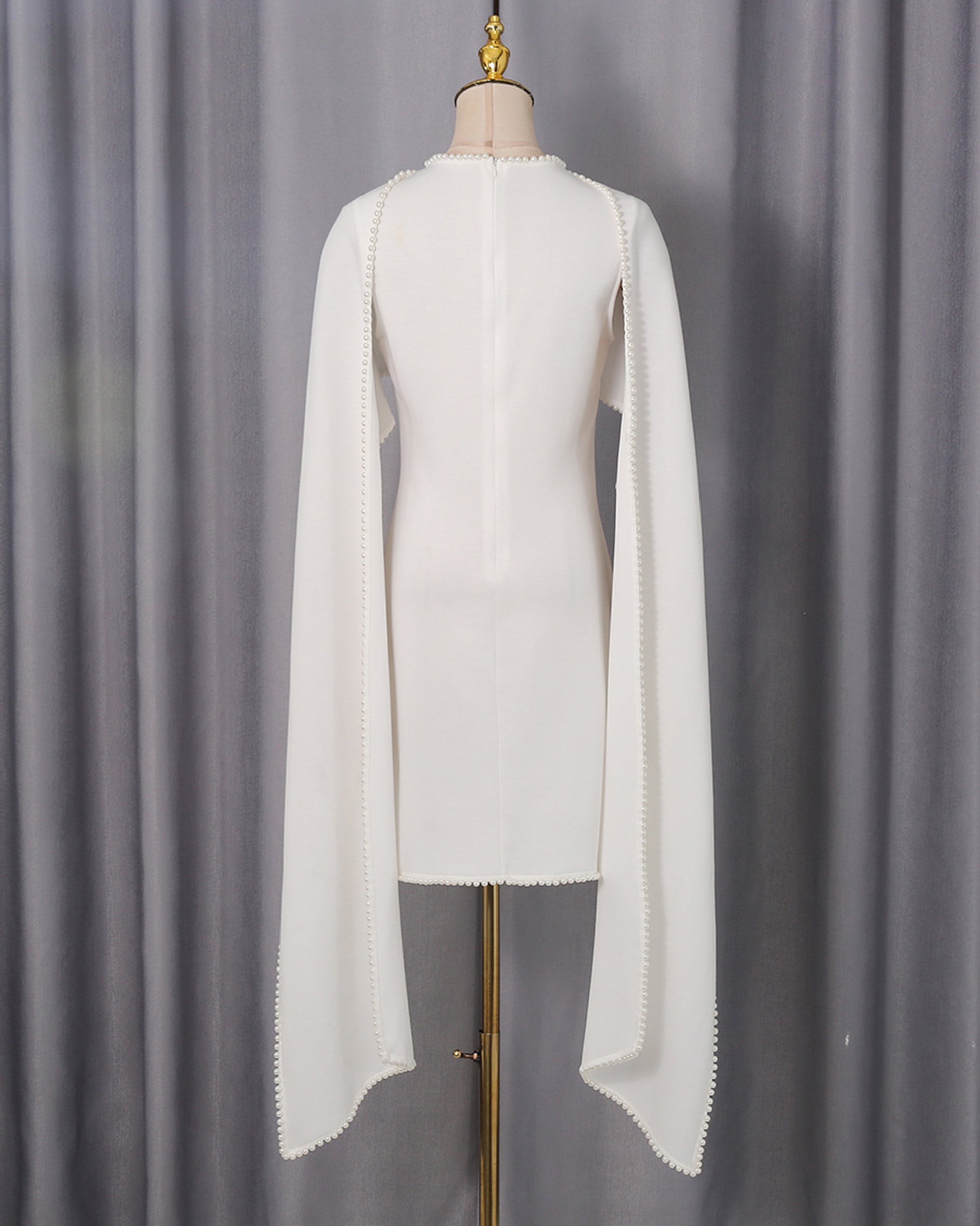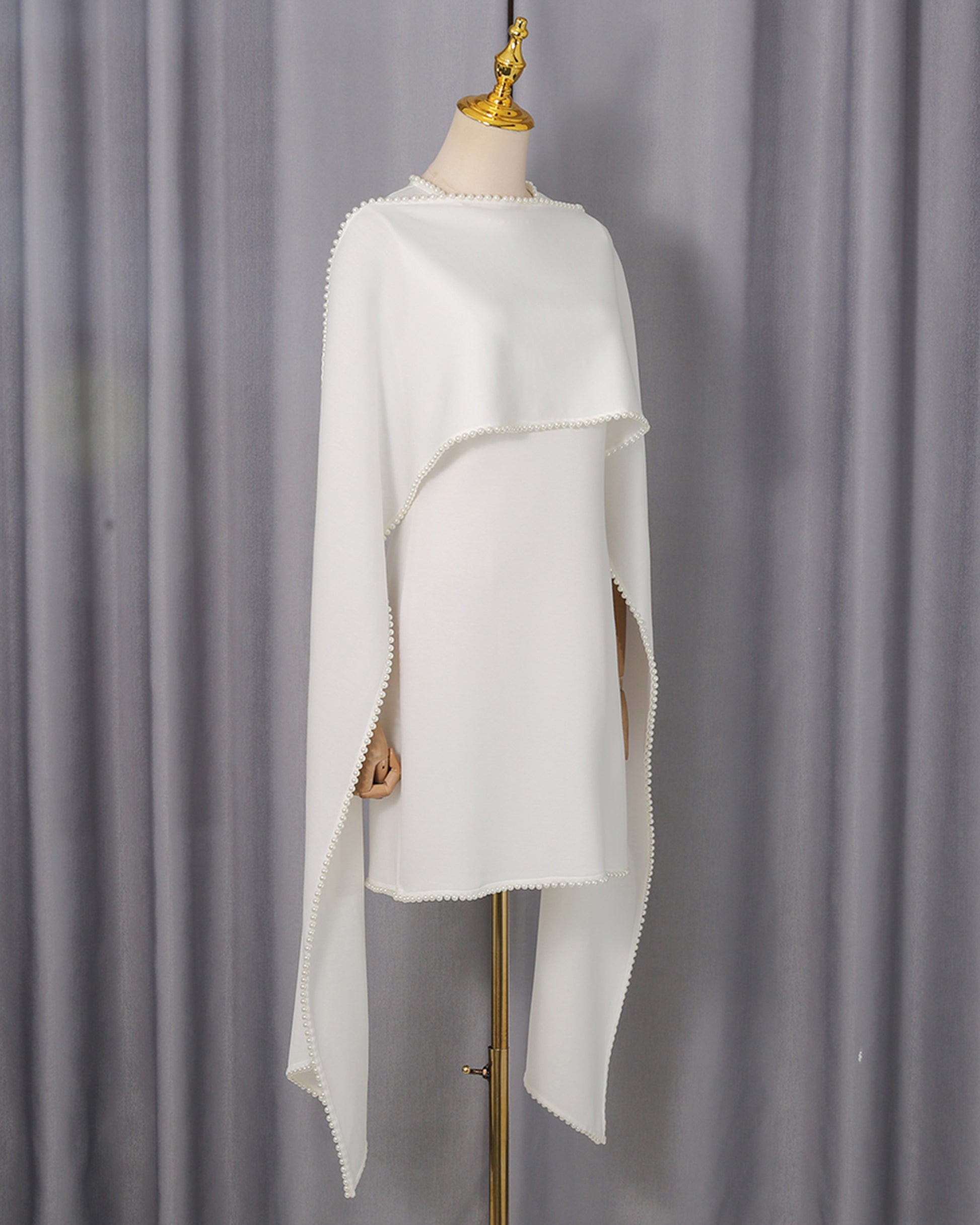 - Sophisticated, regal silhouette with a clean dress base and a dramatic pearl-trimmed cape.