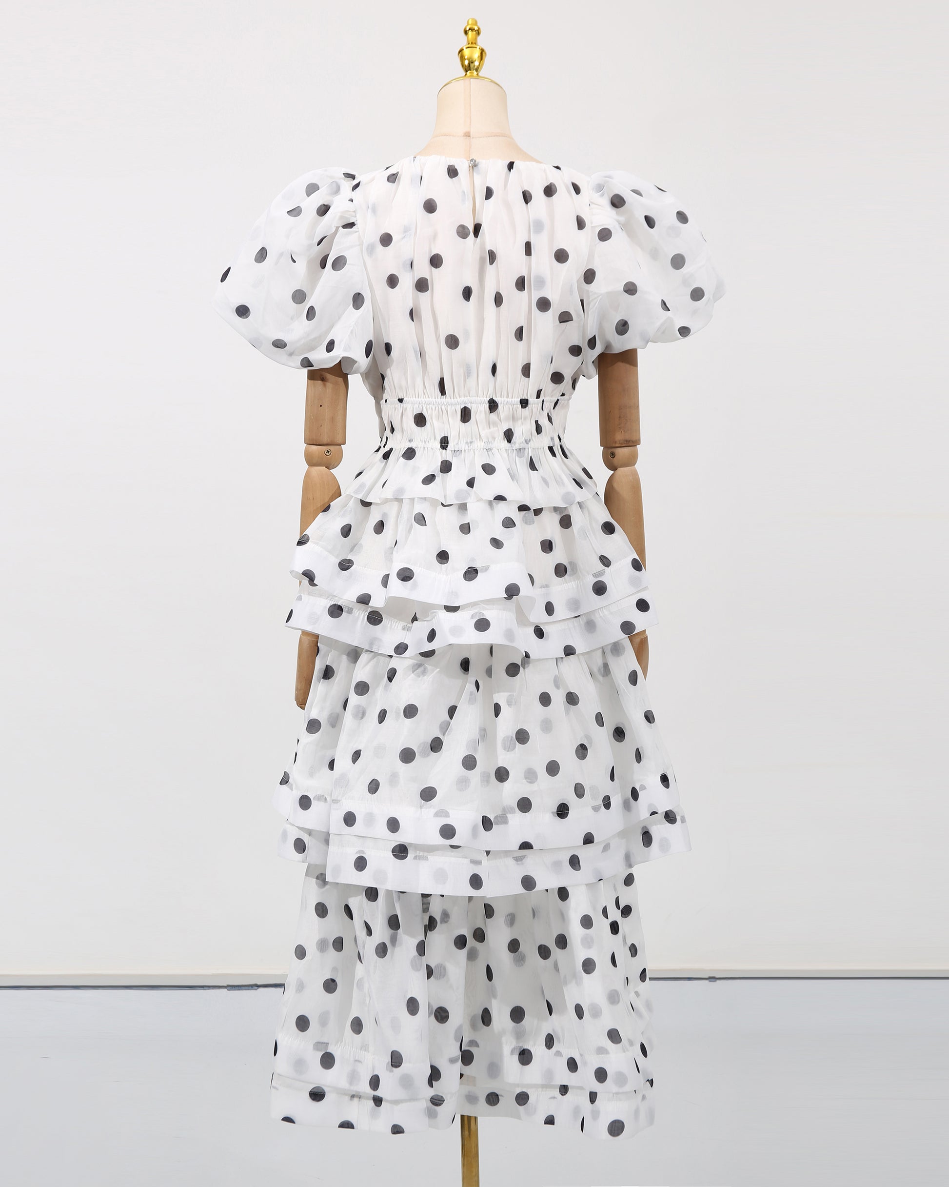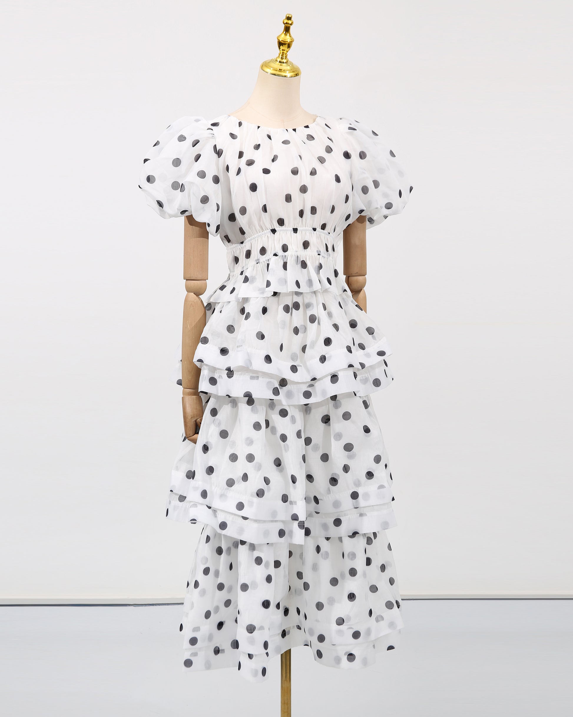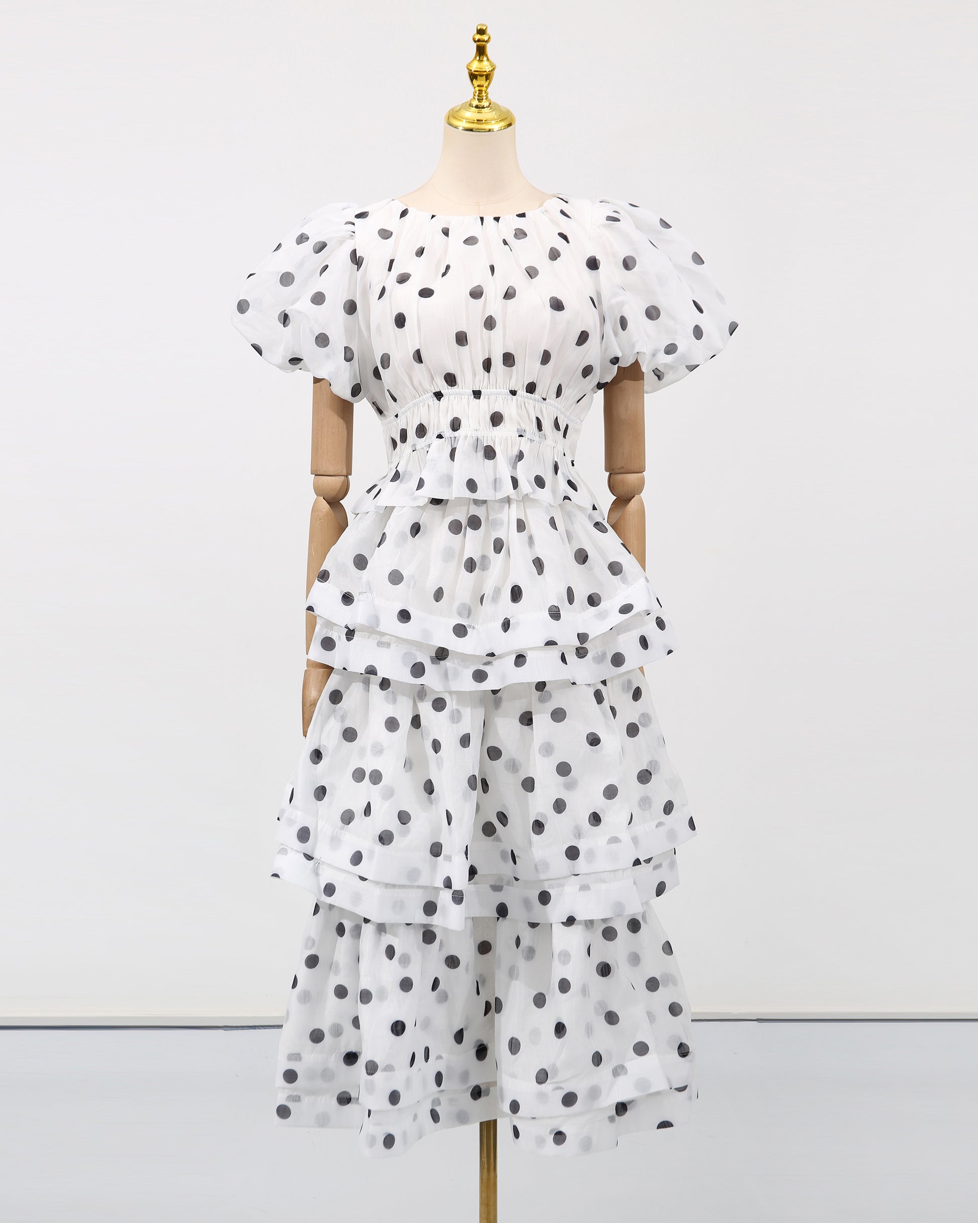 White Polka Dot Puff Sleeve Tiered Dress Set