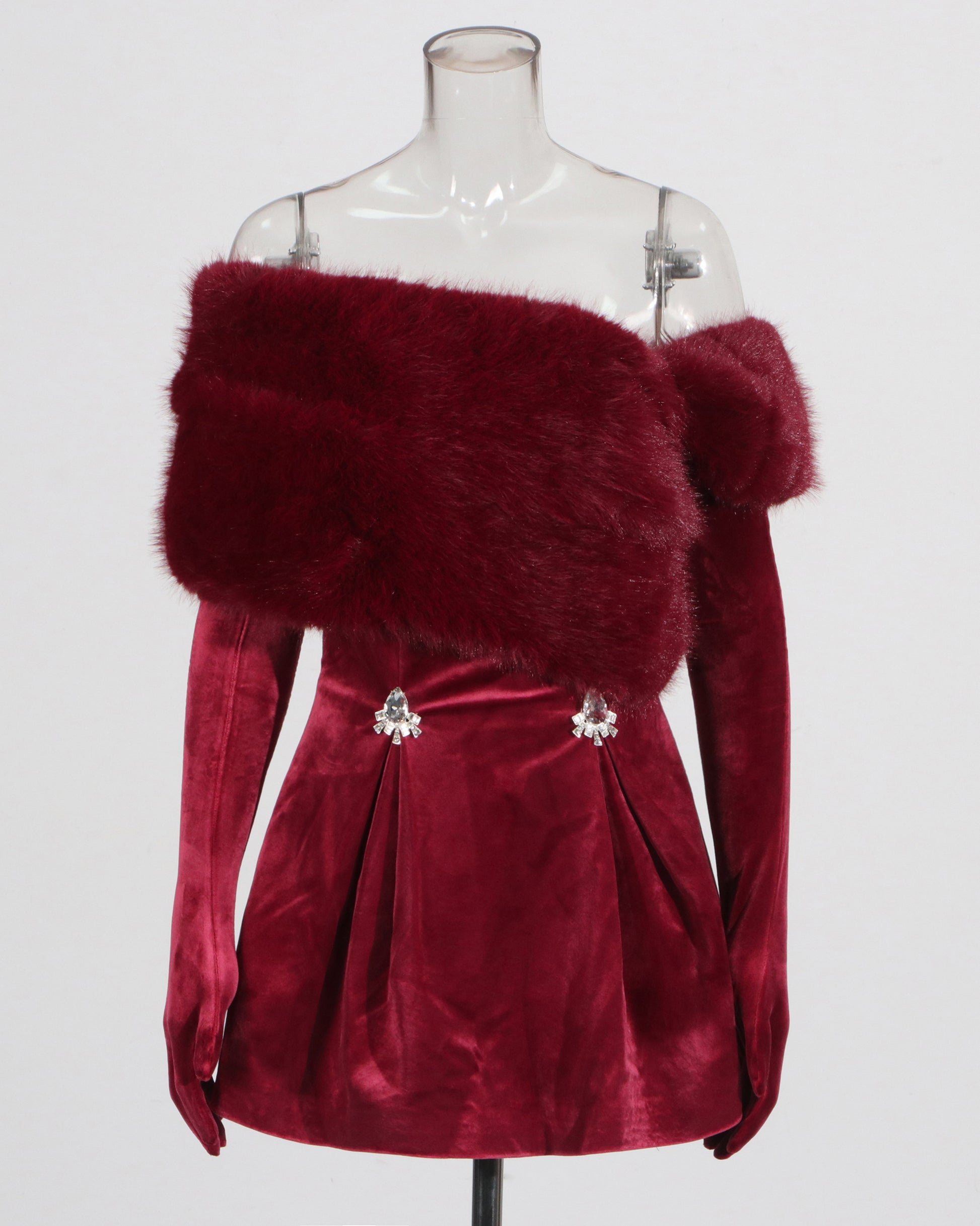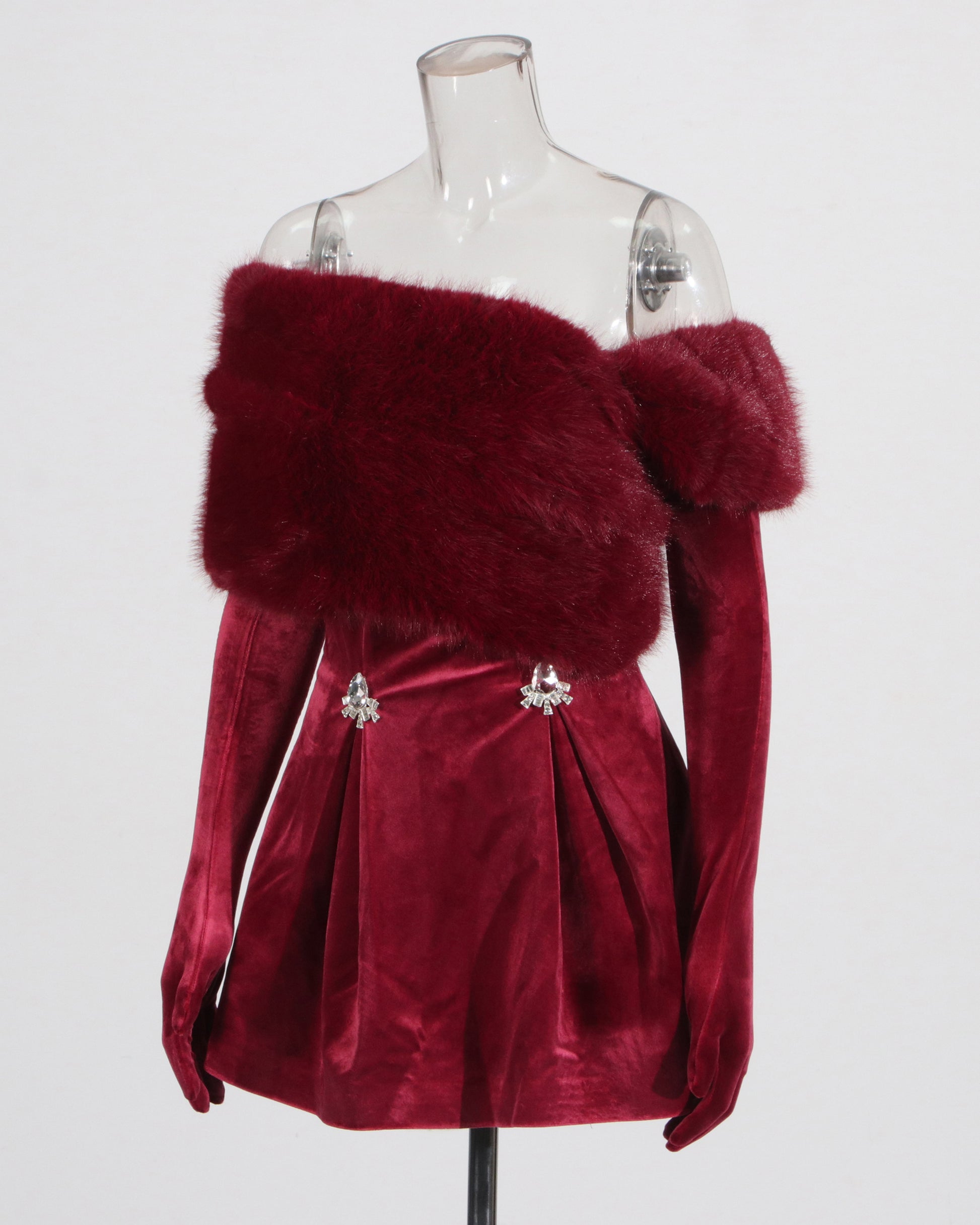 Wine Red Velvet Dress with Fur Collar & Crystal Accents