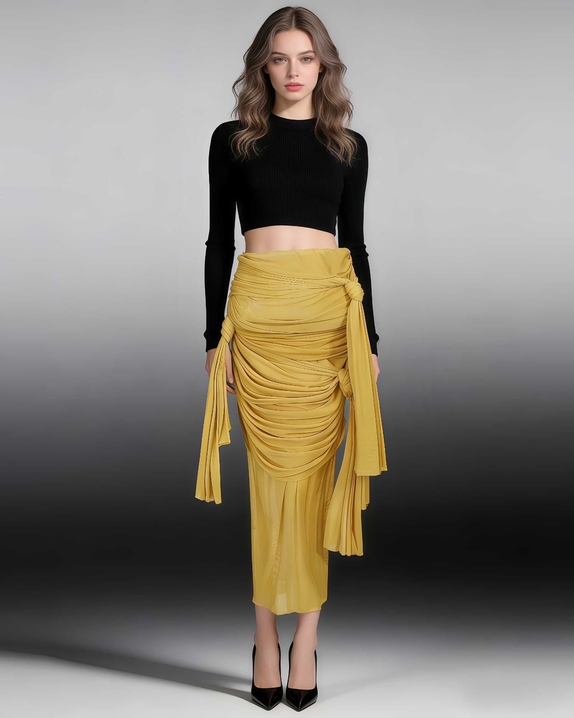 Yellow Ruched Mesh Midi Skirt with Knot & Draped