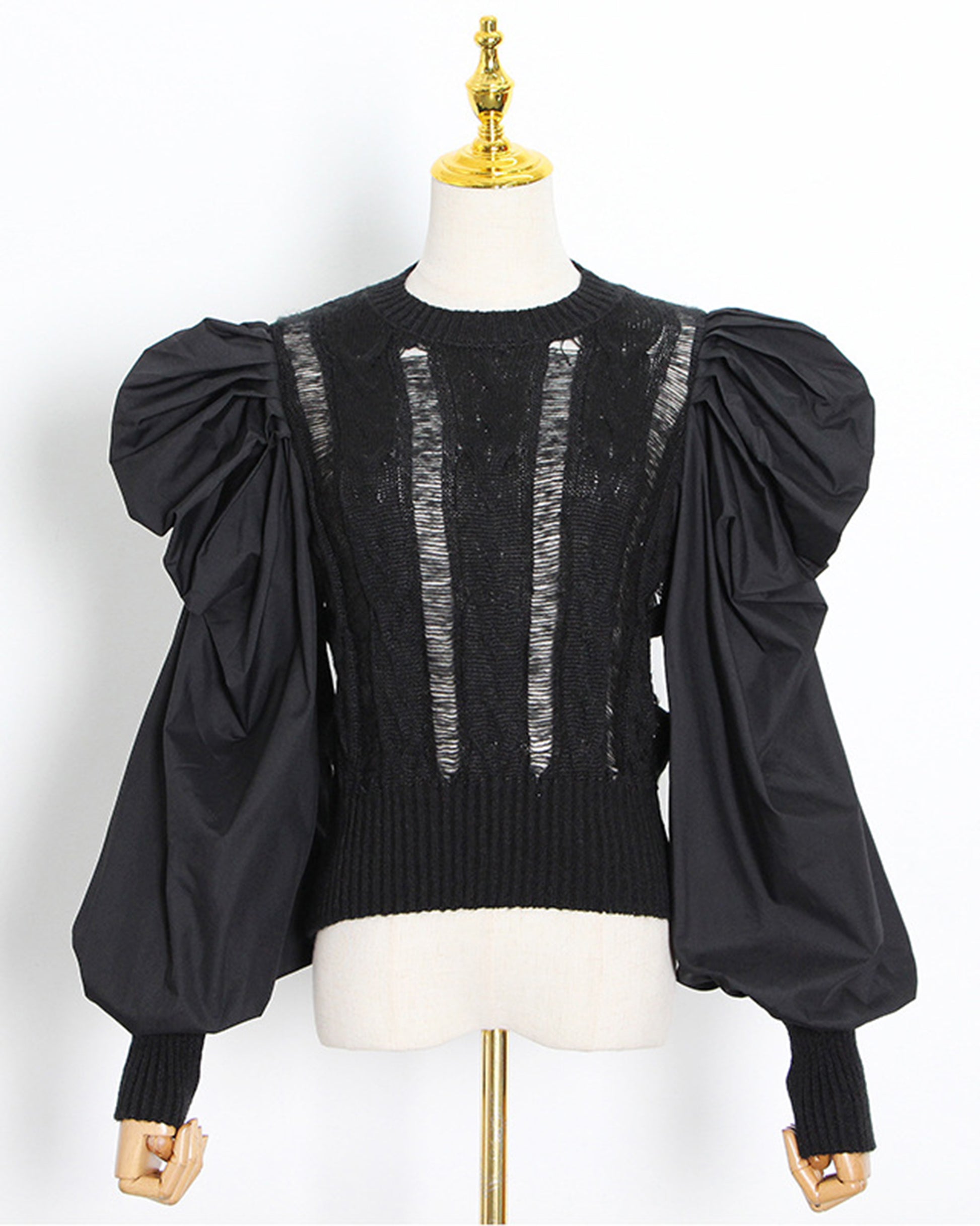 Black Cable-Knit Sweater with Voluminous Puff Sleeves