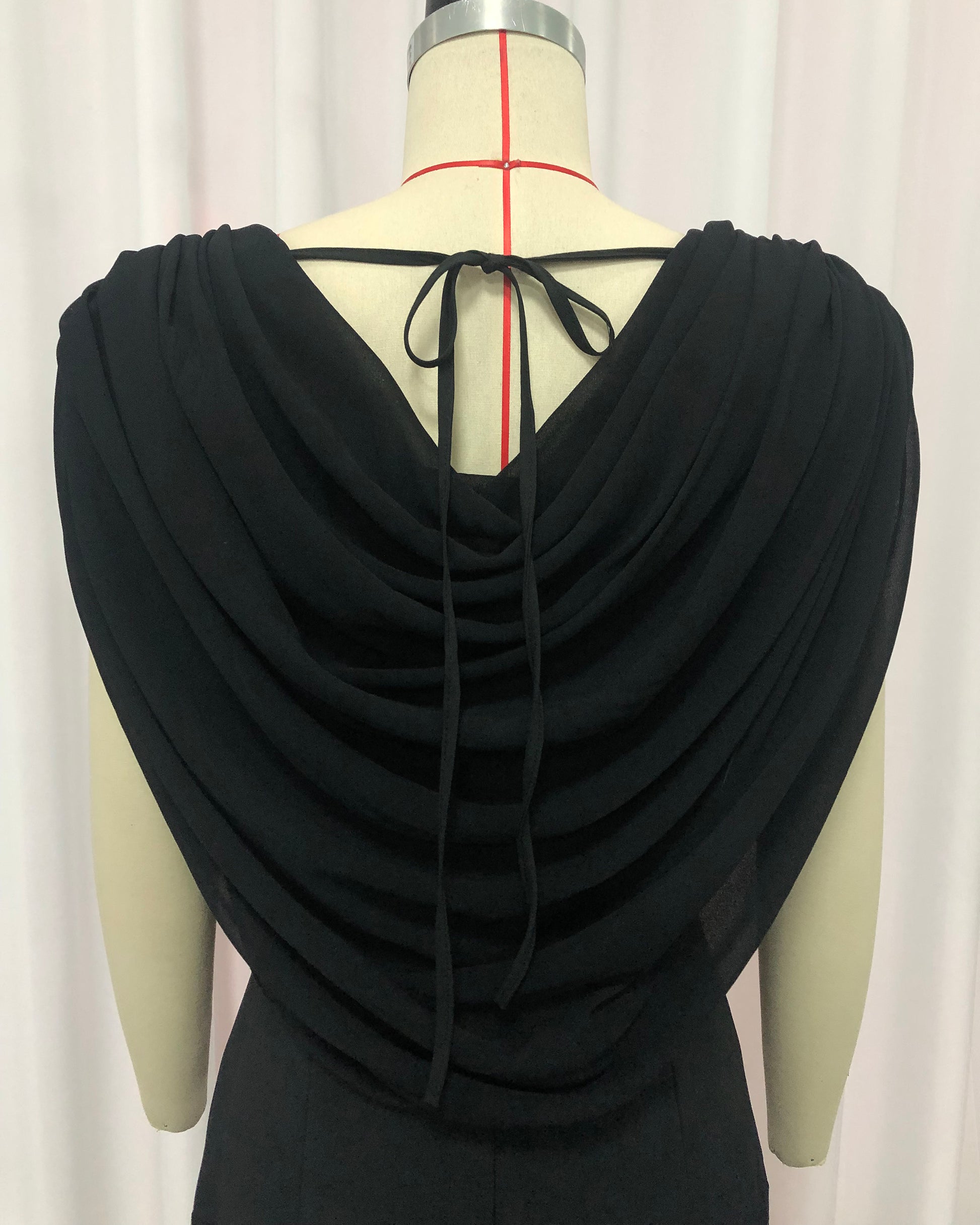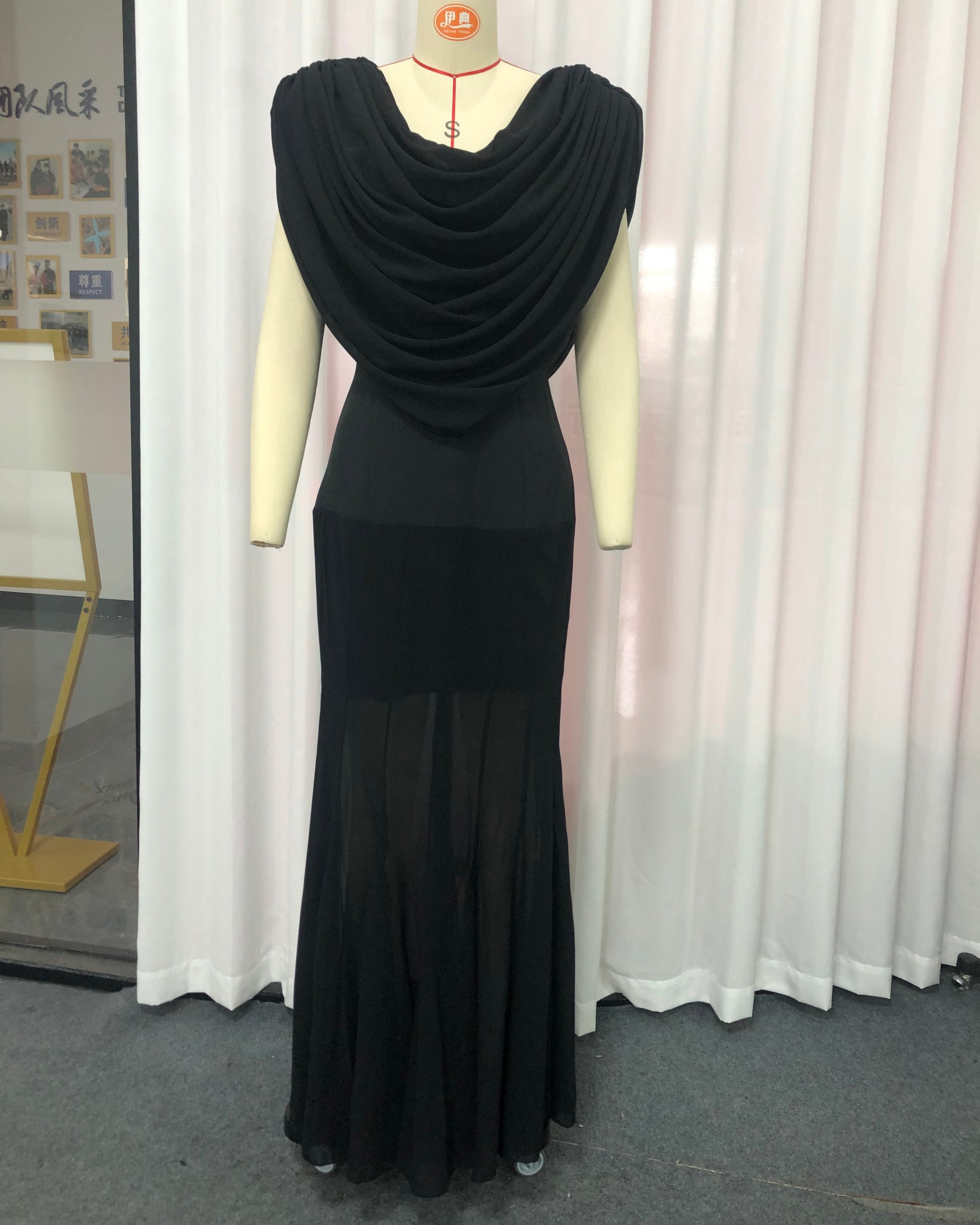 - Sophisticated, timeless silhouette with a dramatic cowl neck and sheer skirt, designed for a sleek, glamorous look.