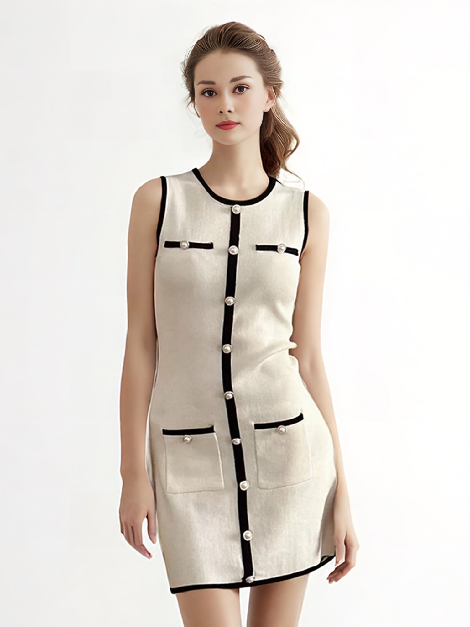 This Elegant Knitting Slimming Dress exudes sophistication and luxury. The delicate knit design, reminiscent of the fashion house Chanel, enhances your silhouette for a slimming effect. The sleeveless style and v-neckline add a touch of femininity to this exquisite piece, perfect for any occasion.