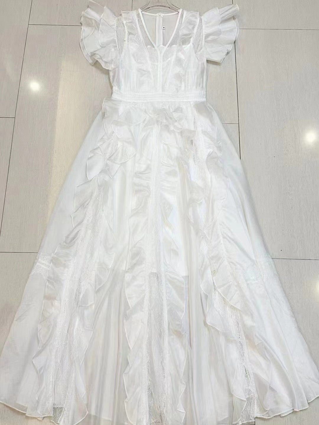 Elegant Patchwork Ruffles V-neck Mesh Midi Dress