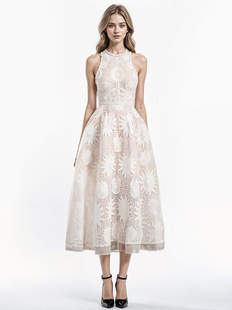 Indulge in the elegance of our Embroidery Solid Dresses. Crafted with delicate lace and intricate floral embroidery, these sleeveless dresses cinch at the waist for a flattering, figure-hugging fit. Elevate your wardrobe with this sophisticated and exclusive piece that effortlessly exudes luxury and class.