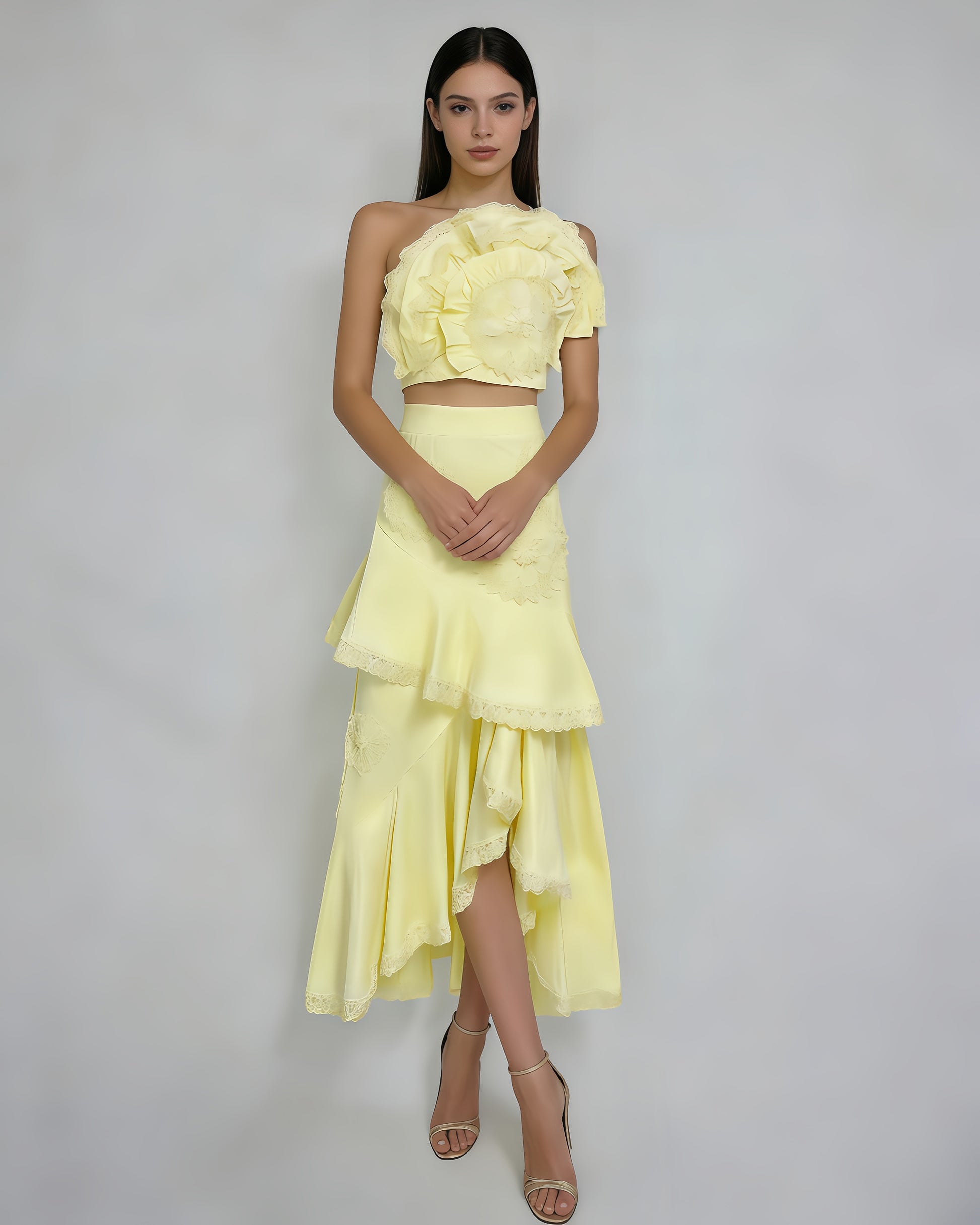 Yellow One-Shoulder Crochet Ruffle Two-Piece Set