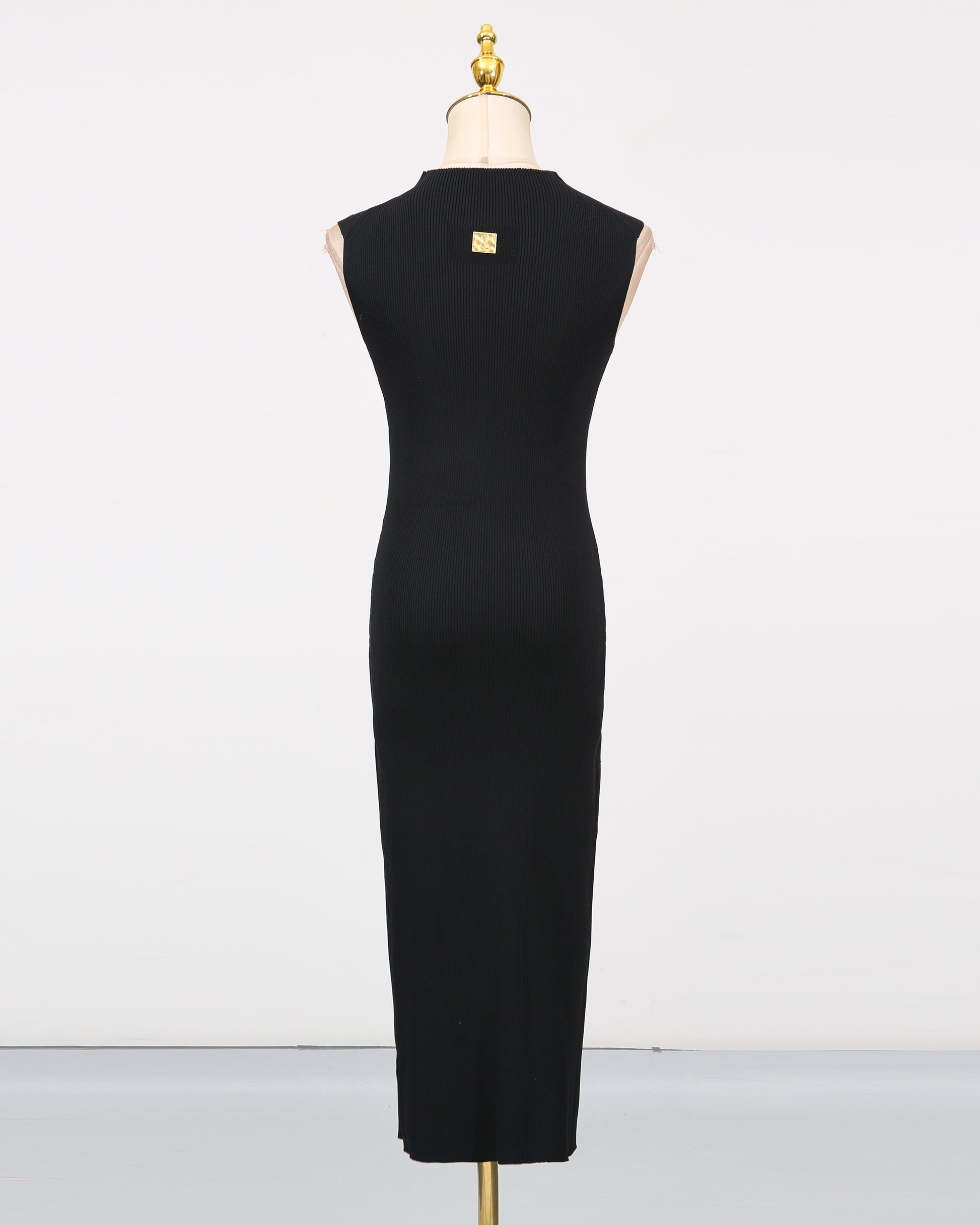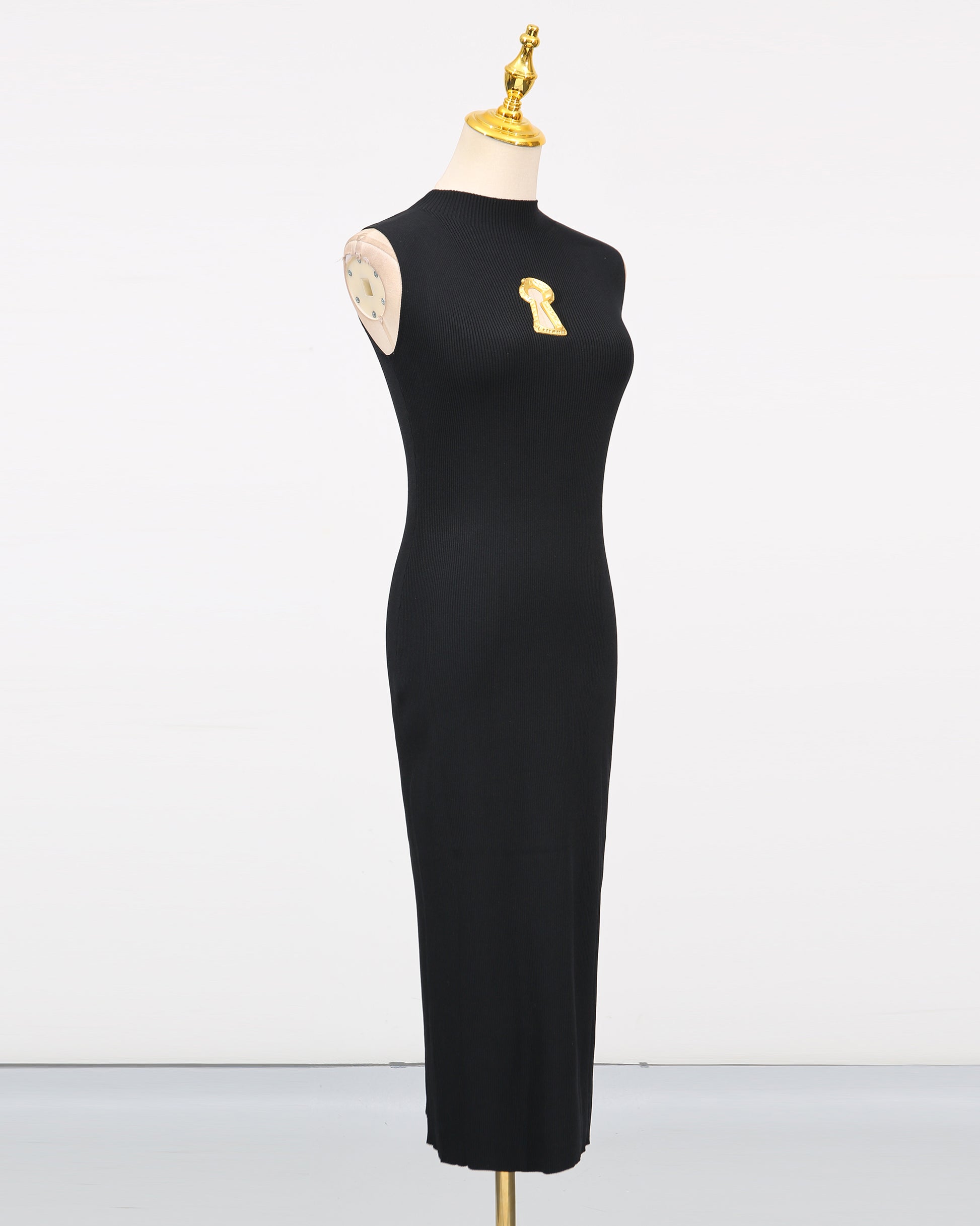 A sleek knit dress: sleeveless design + ribbed texture + gold keyhole-shaped brooch at chest + form-fitting midi length.