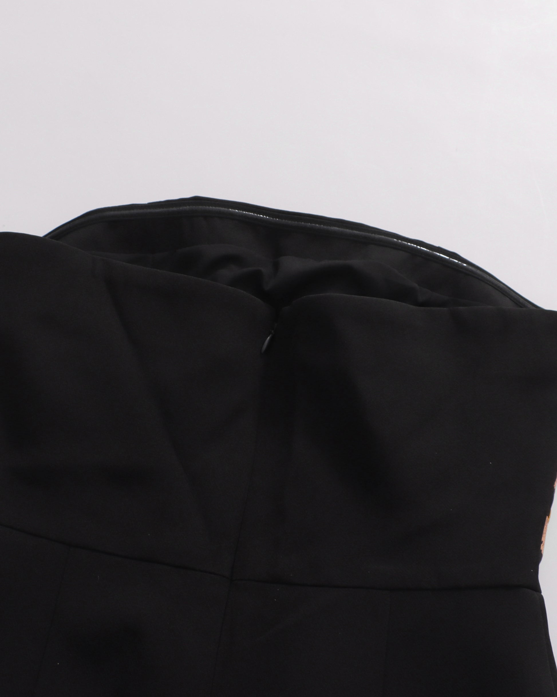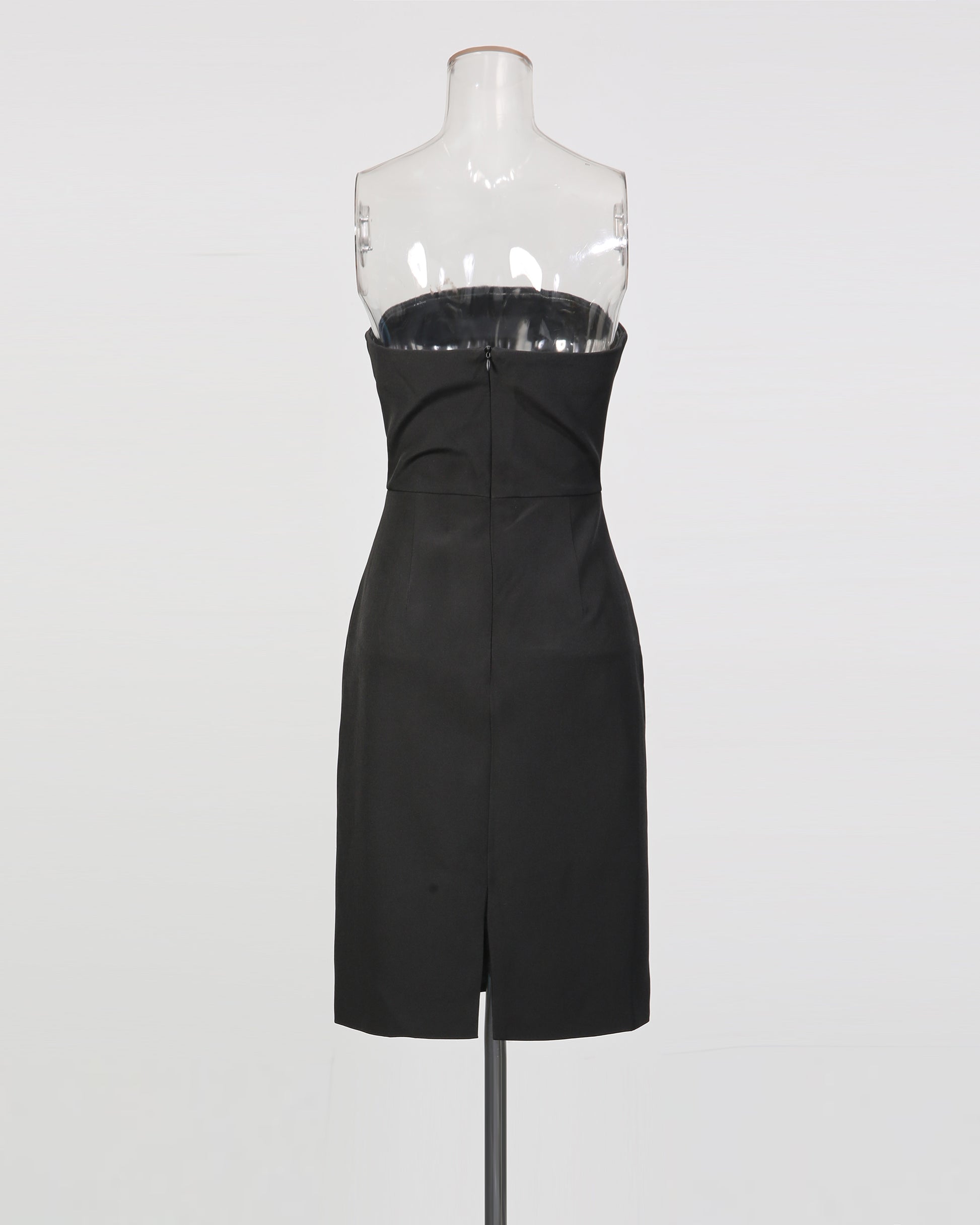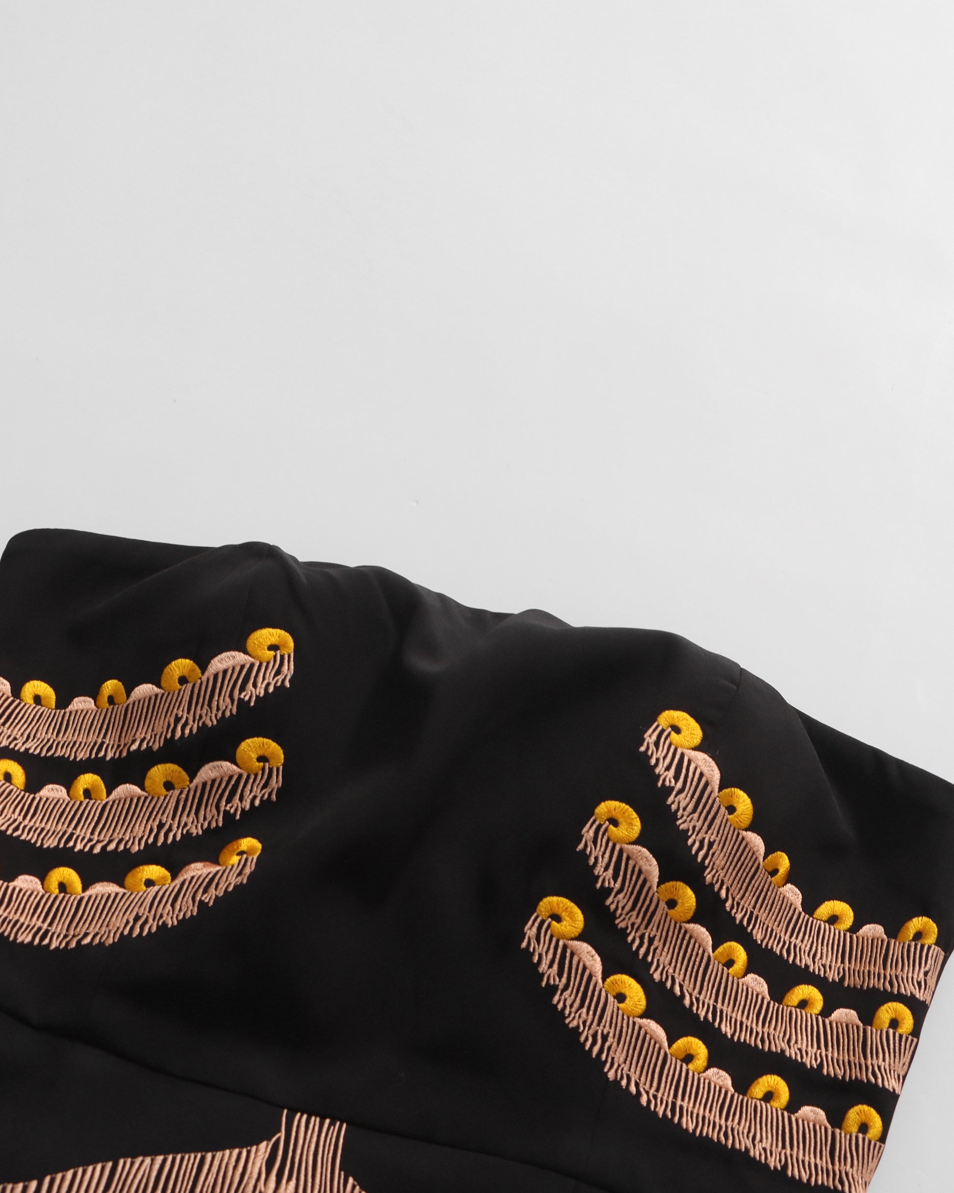 A bold black dress: strapless design + fringe & bead accents + fitted silhouette.