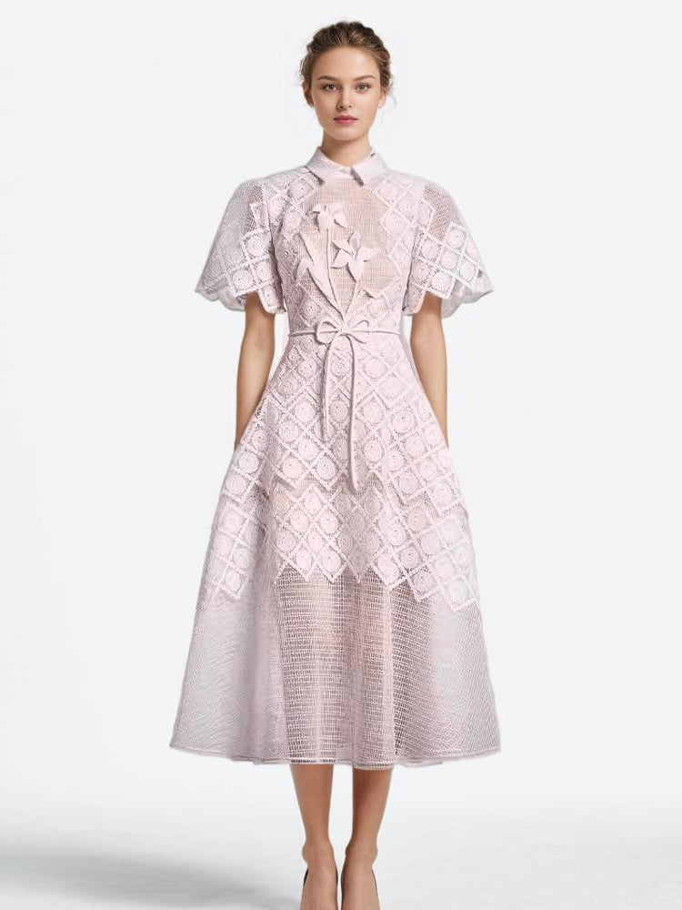 Elegant and sophisticated, our Temperamen dress is a work of art. The spliced mesh fabric features a unique floral and diamond pattern, while the stand collar and jagged sleeve cuffs add a touch of luxury. Perfect for making a statement at any exclusive event.