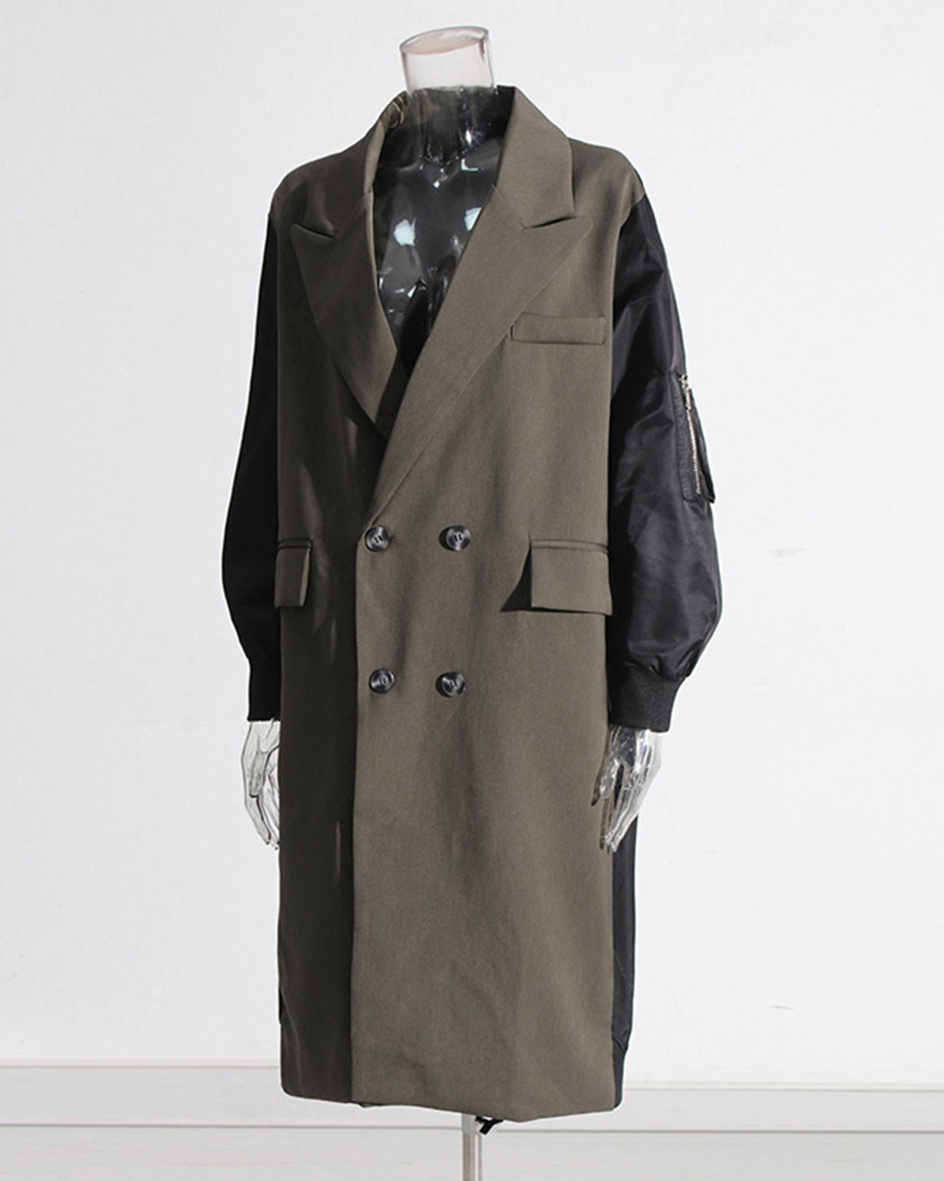 A trendy khaki coat: double-breasted design + black contrast sleeves + oversized fit.