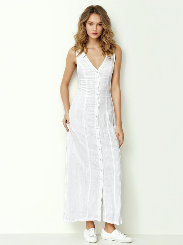 Indulge in the ultimate luxury with our Sensual V-Neck White Split Sleeveless Dress. This elegant and sophisticated dress features a sexy V-neckline and a stylish high slit. Perfect for making a statement at any event, this dress is a must-have for the fashion-forward and elite. Elevate your wardrobe with this exclusive piece.