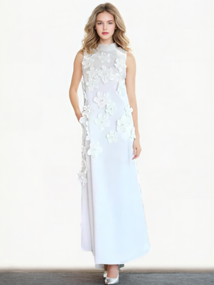 Experience the elegance and charm of our Patchwork Lace Up A Line Dress. Handcrafted with intricate flower detailing and a high neckline, this sleeveless dress exudes a sense of sophistication and design. A perfect addition to your wardrobe for any occasion.