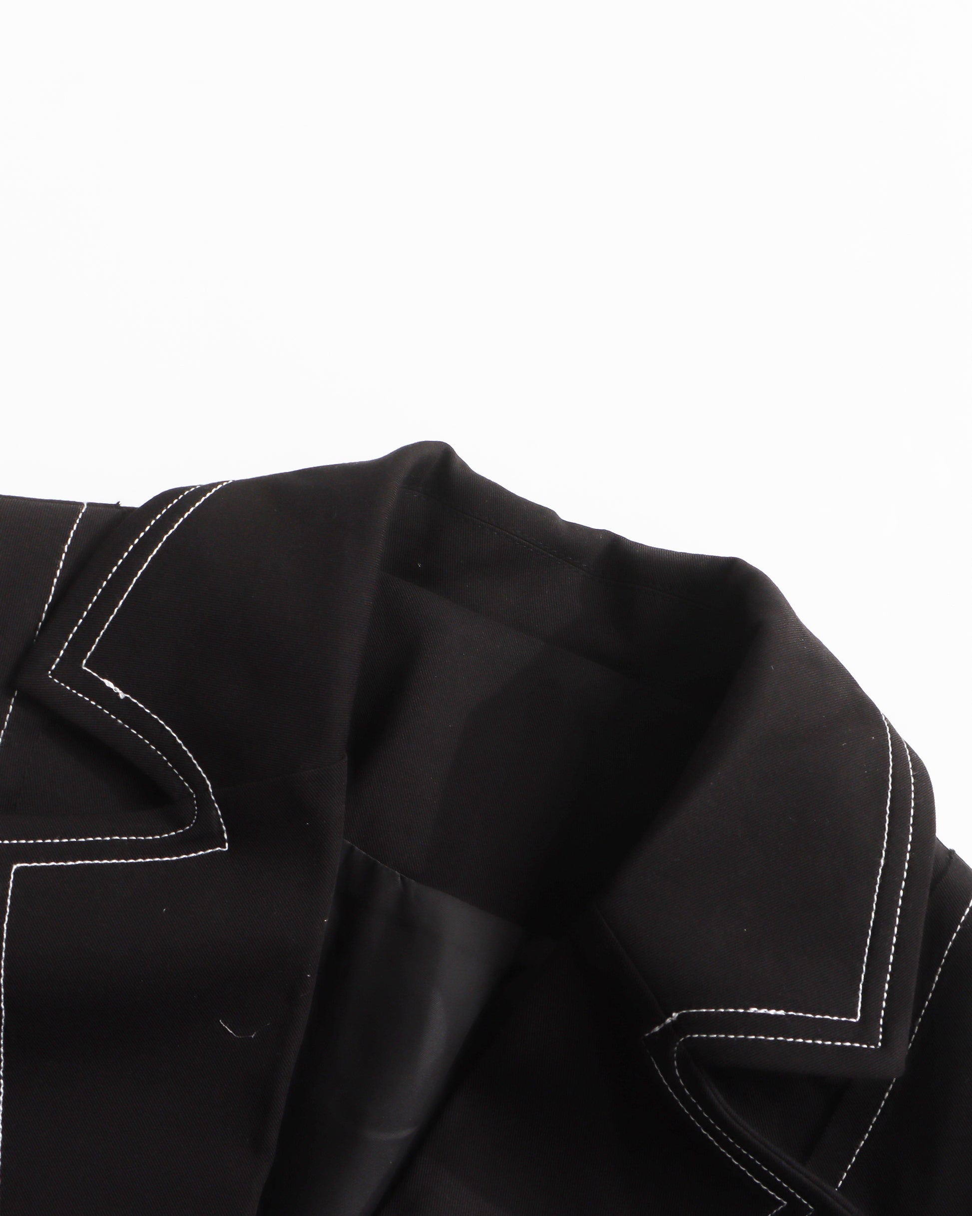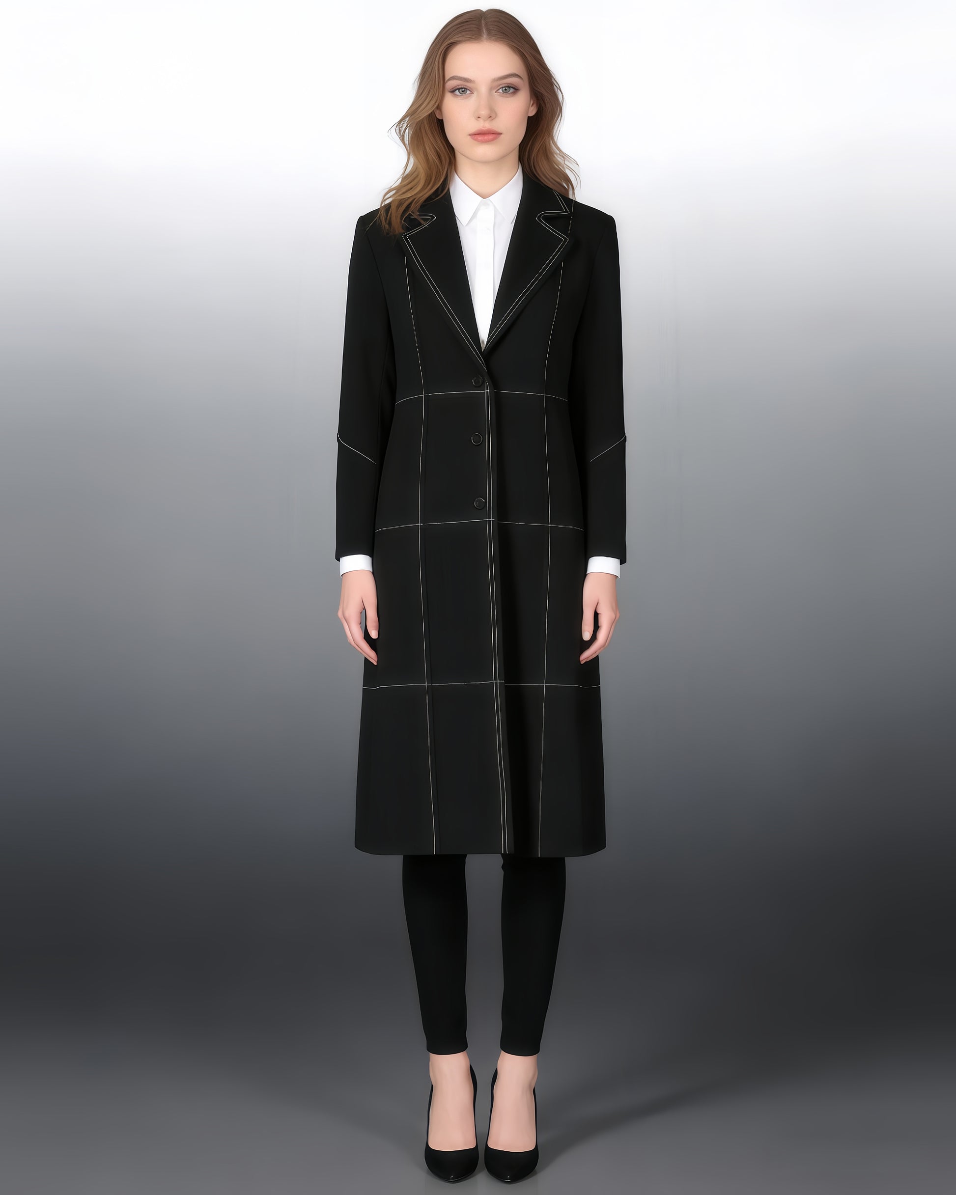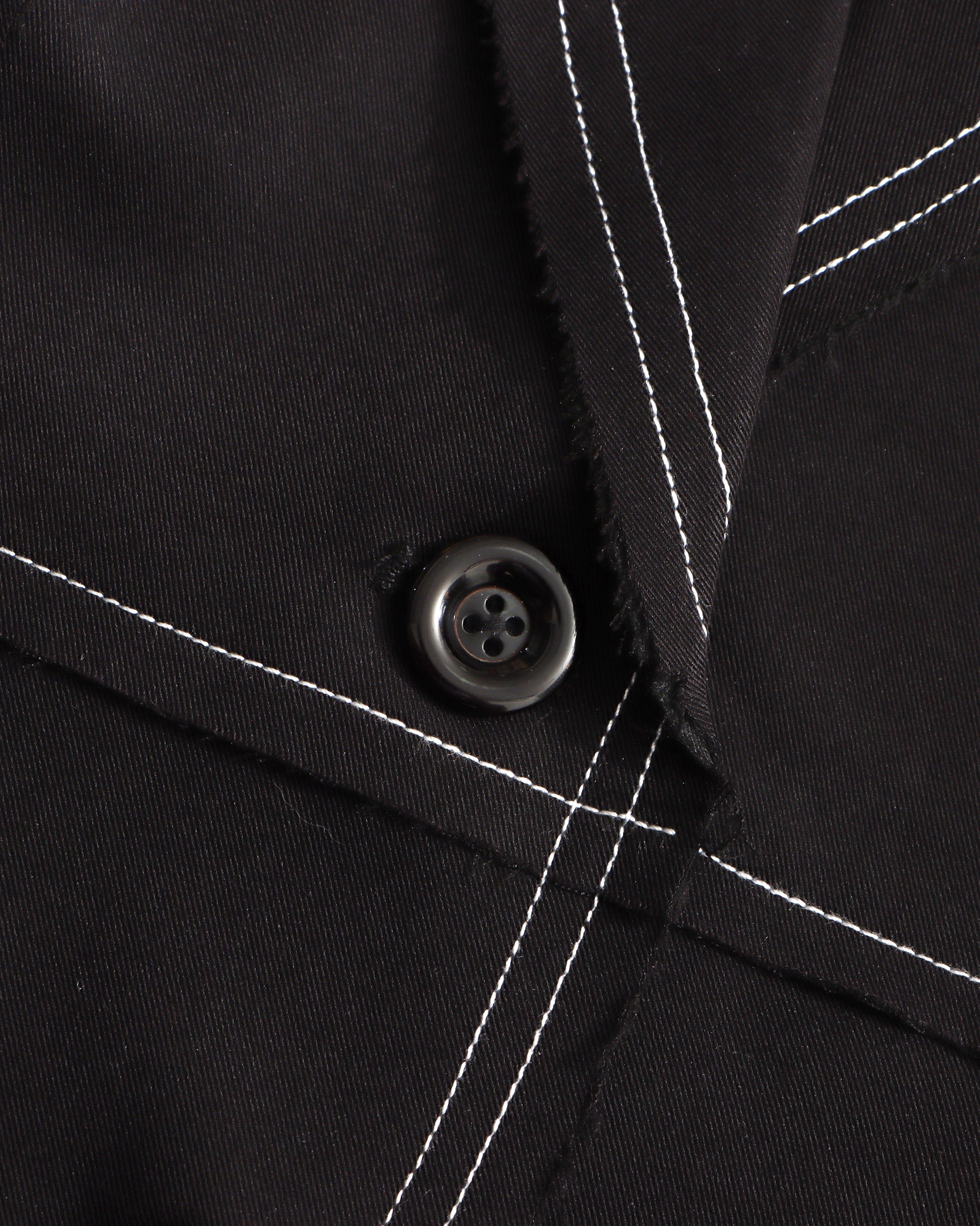 - Edgy, structured silhouette, blending minimalist style and bold details.