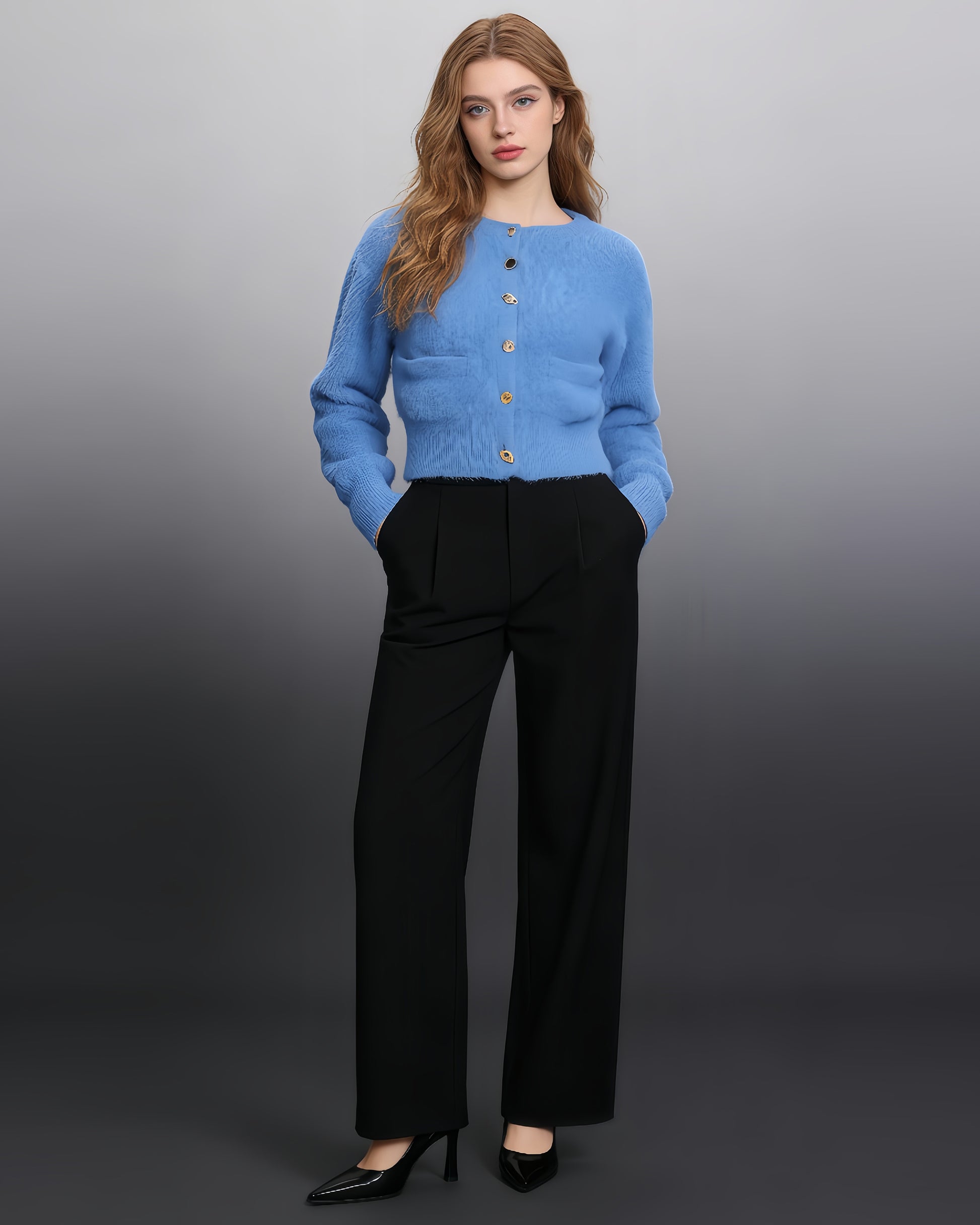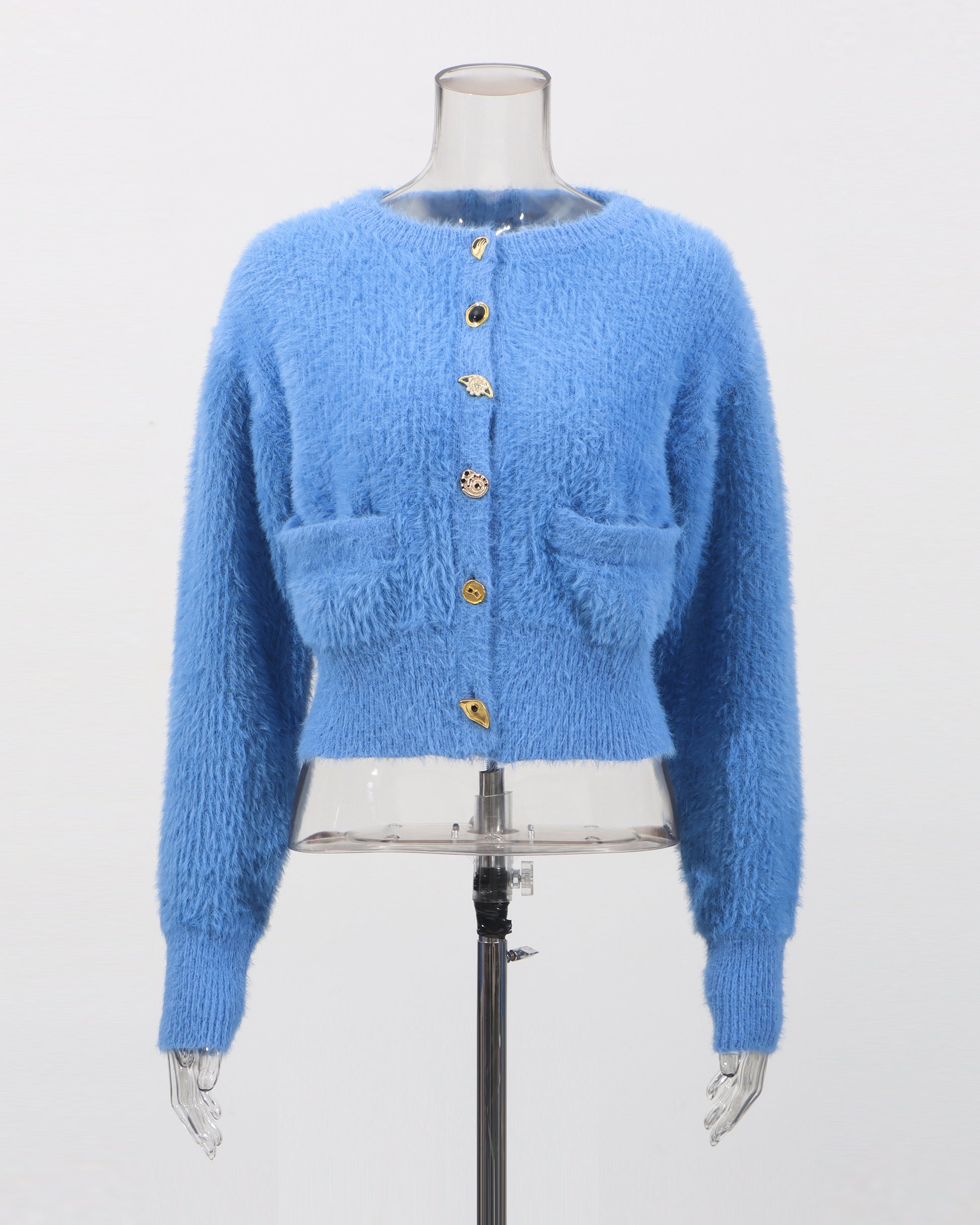 Blue Fuzzy Cropped Cardigan with Decorative Buttons