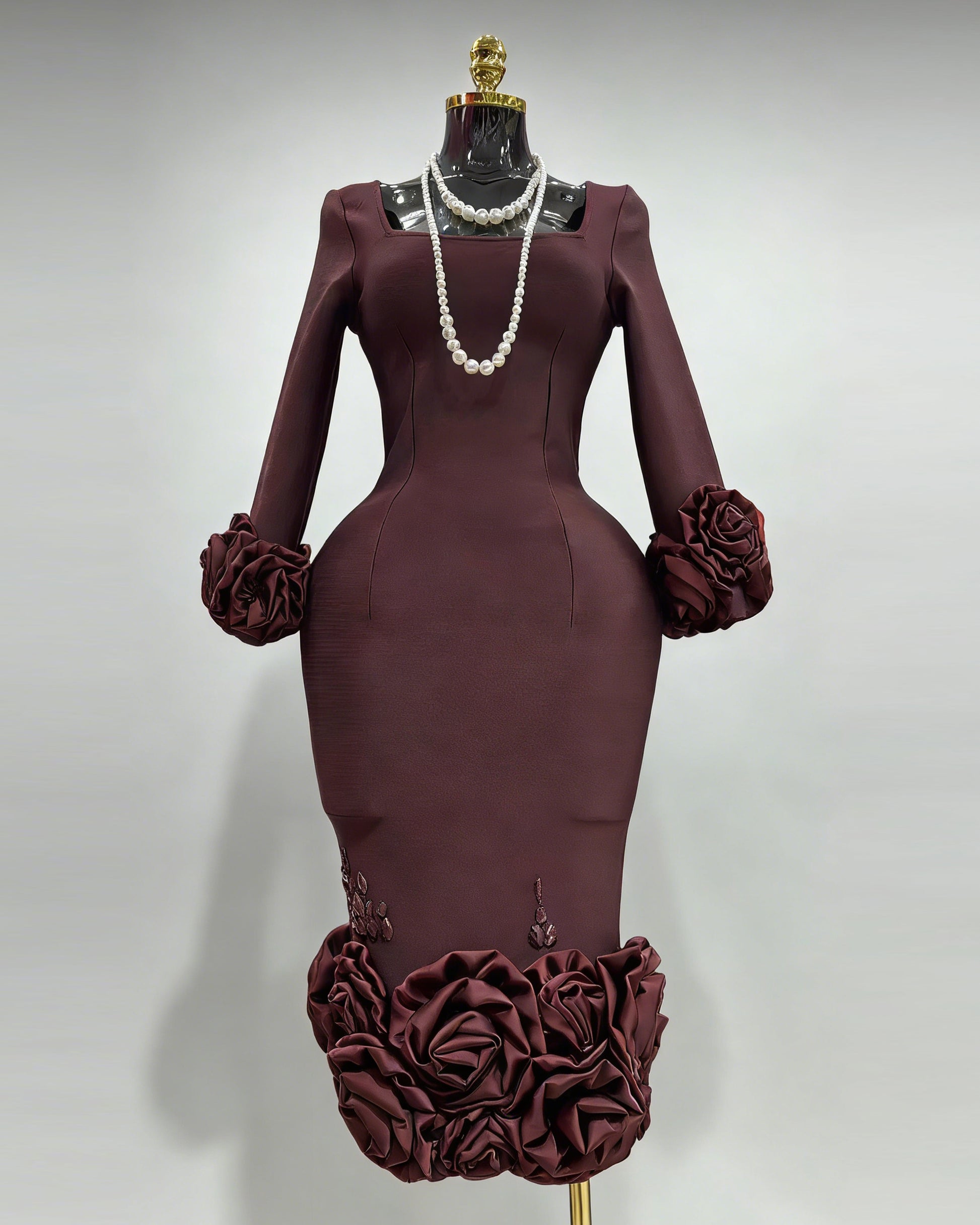 Burgundy 3D Rose Floral Fitted Midi Dress