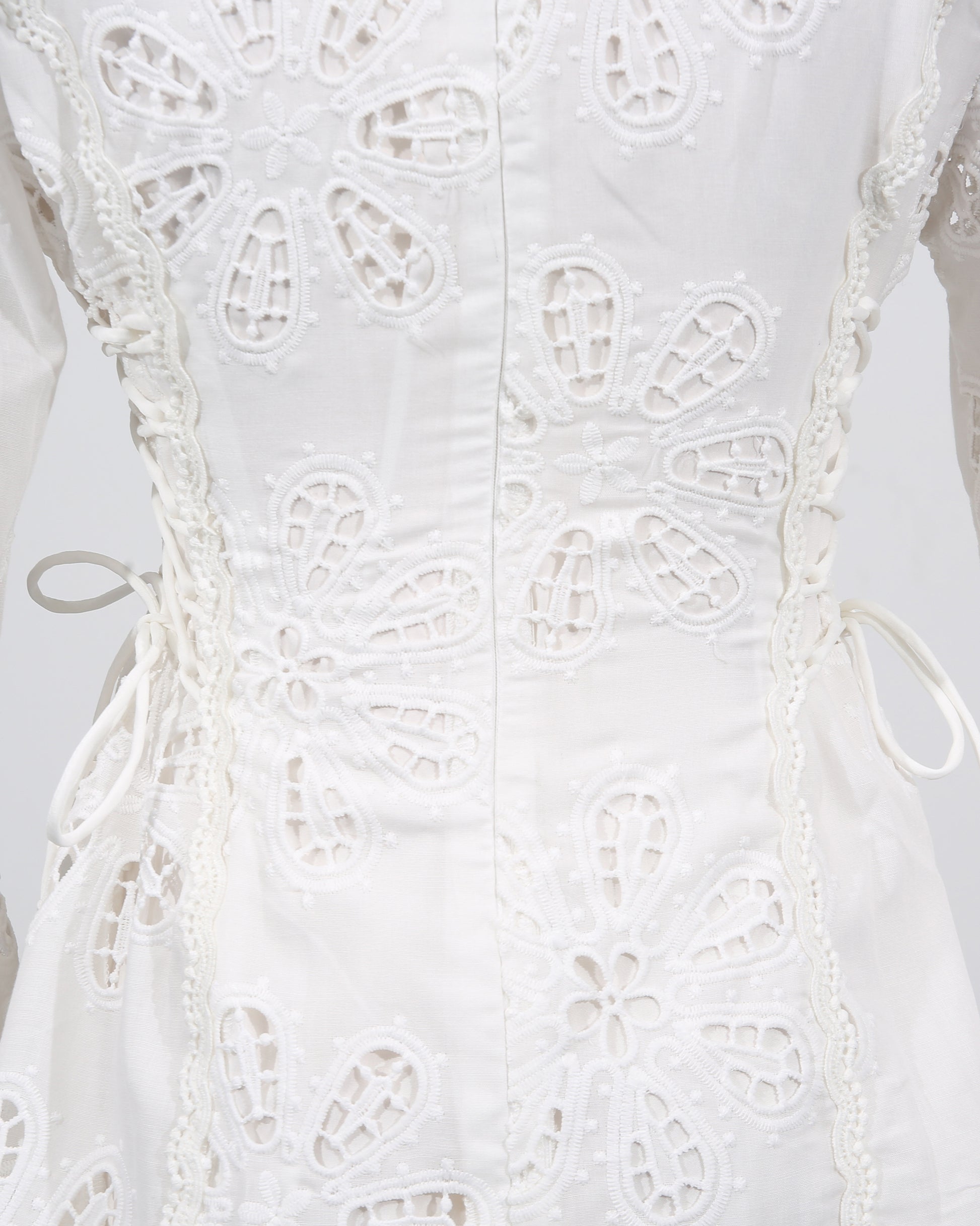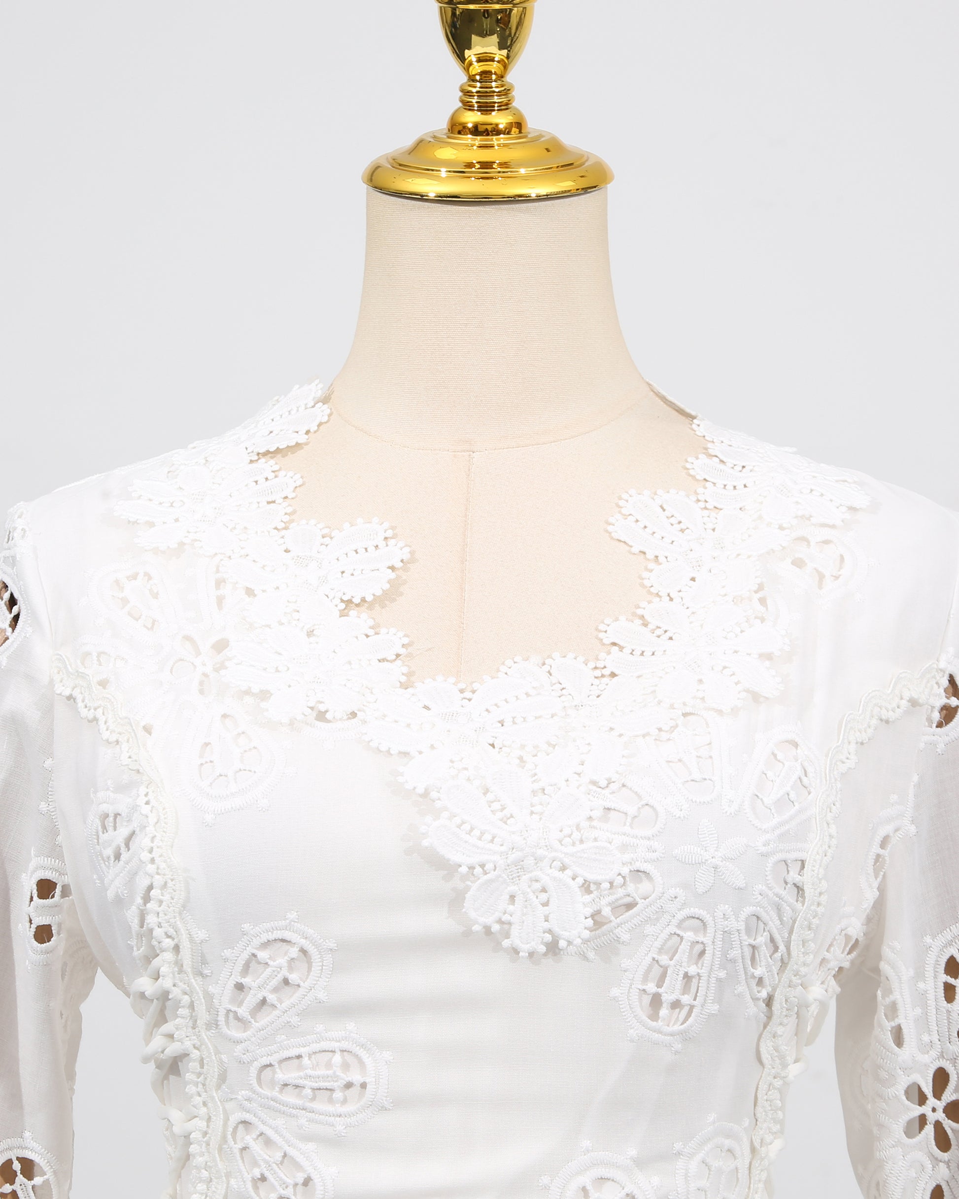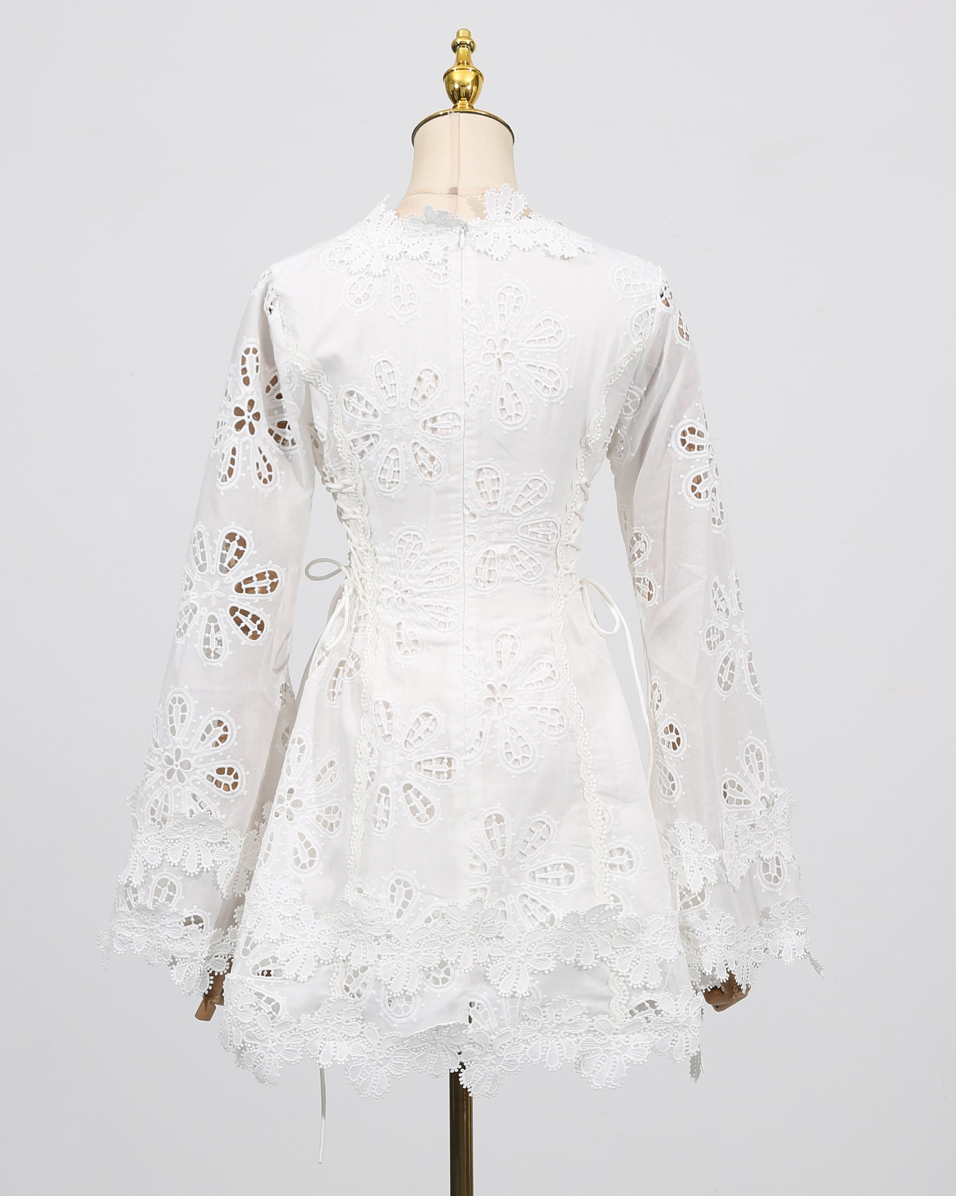 - Delicate, feminine silhouette with intricate floral lace and flared bell sleeves.